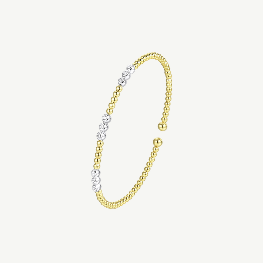 Elevate your style with our Diamond Bezel Beaded Cuff. Three bars of bezel set round...