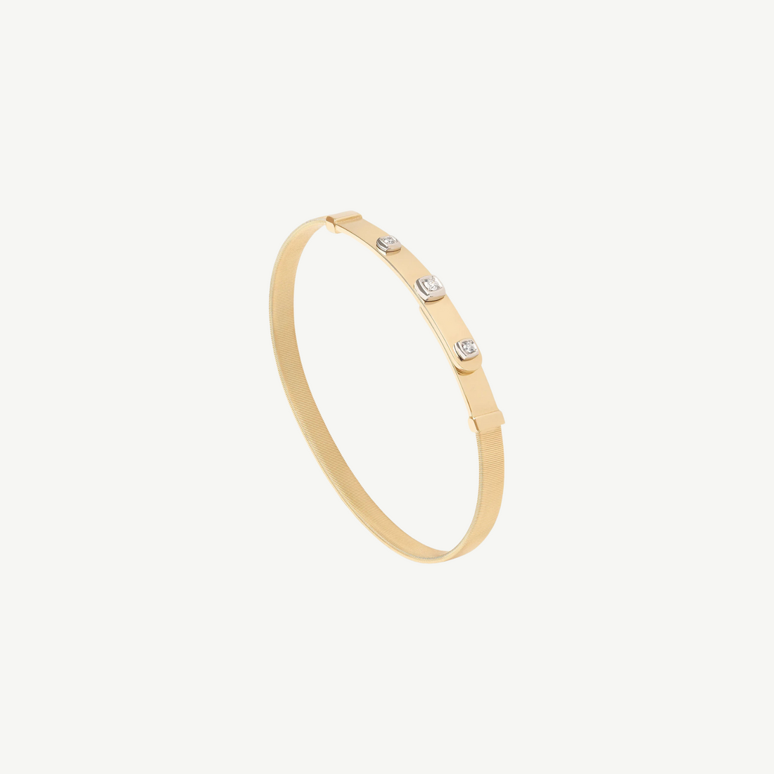 Discover streamlined elegance in this 18K yellow gold bangle studded with three diamonds in a...