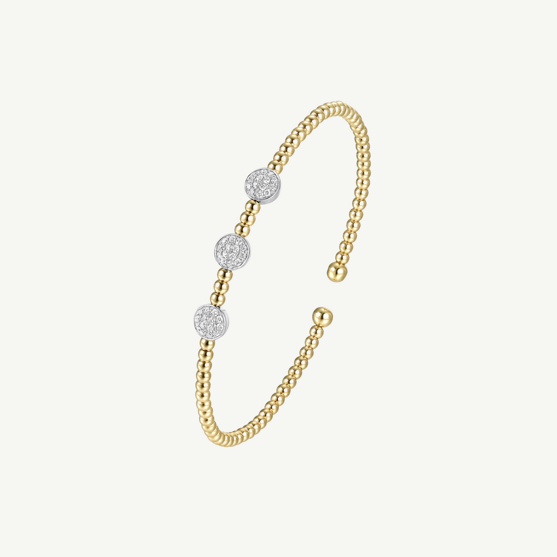 This magnificent bracelet features three stunning pave diamond circles on a delicate yet sturdy gold...