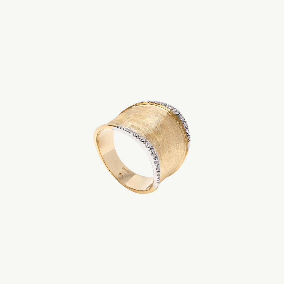 Featuring an irregular surface and linear design, this 18K yellow gold diamond band ring has...