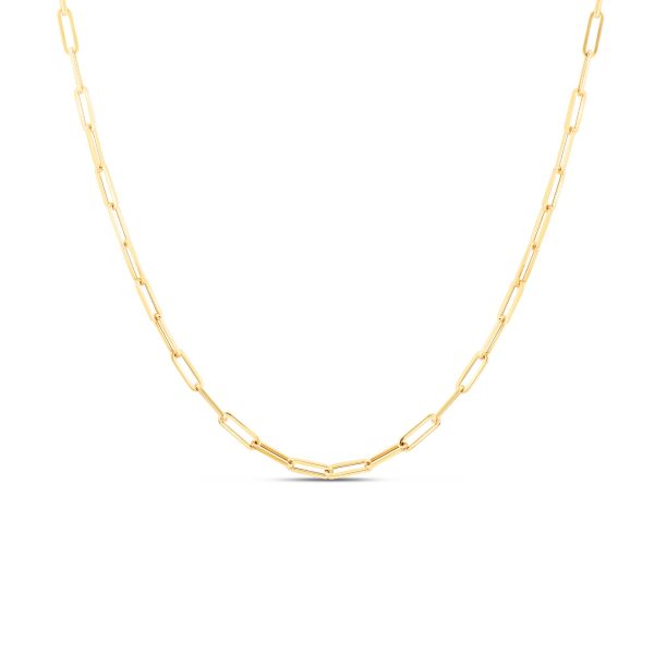 Sleek and elegant, this 18K yellow gold necklace features long, thin paperclip links for a...