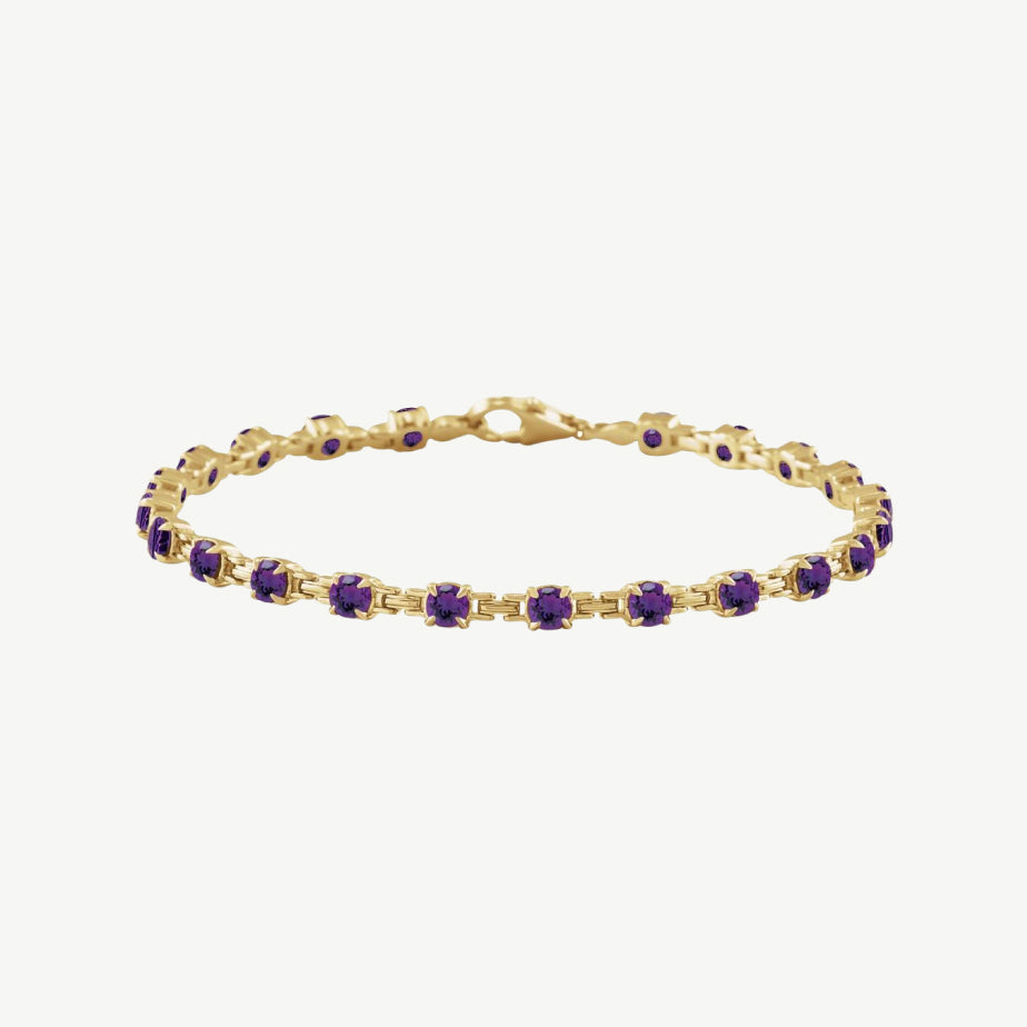 Indulge in the luxurious elegance of our Amethyst Line Bracelet. Crafted with 22 natural amethyst gems, each 3.5 wide, set in solid 14K yellow gold. Elevate any outfit with this sophisticated and exclusive purple piece. A true masterpiece of art and fashion.