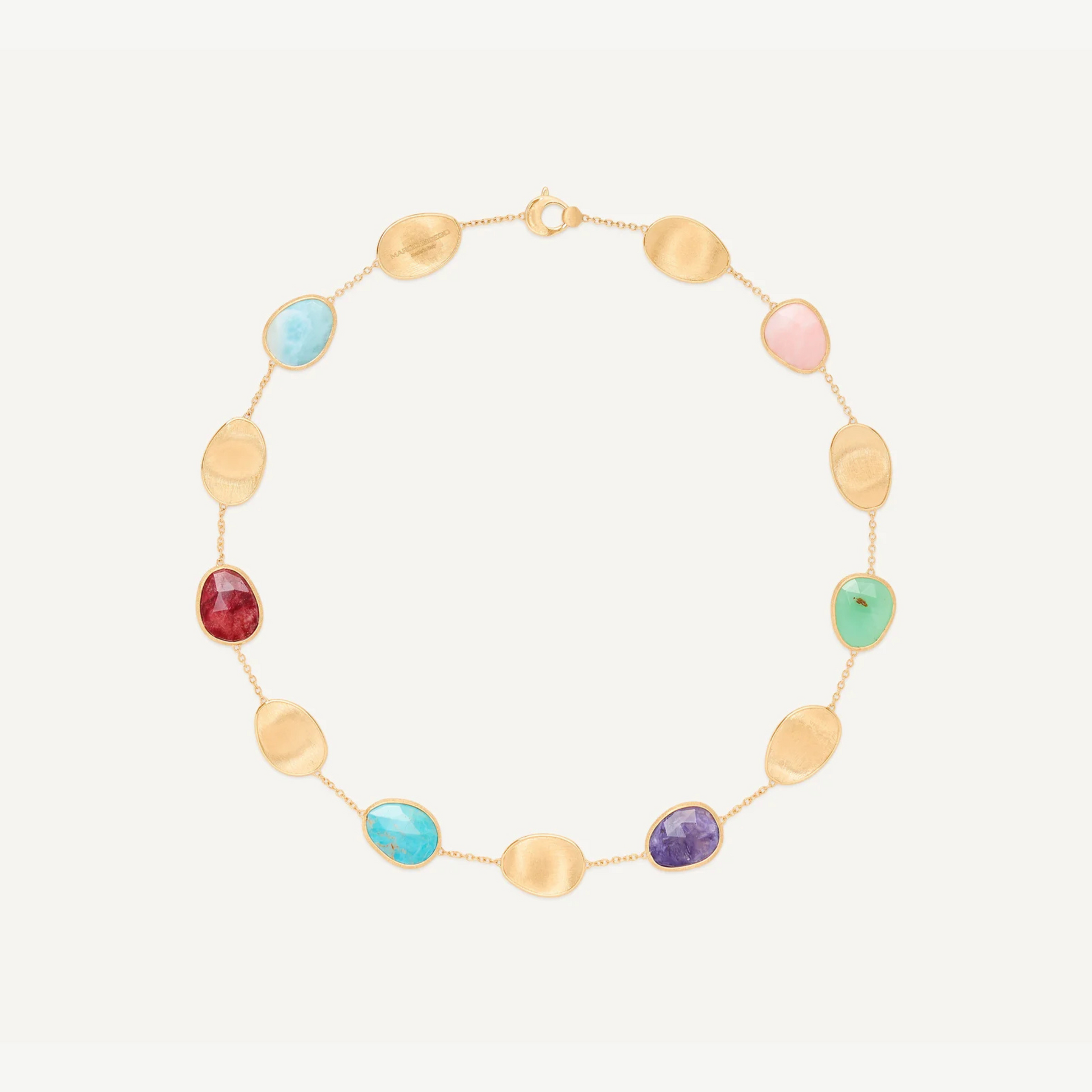 Elegant and striking, this necklace features a refined sequence of light 18K yellow gold leaves and a mix of colorful gemstones including turquoise, charoite, thulite, rose quartz, and aquamarine. The gold leaves are meticulously hand-engraved using the ancient Florentine technique, interspersed with a delicate chain. The perfect piece to complete any look with a vibrant touch of color.