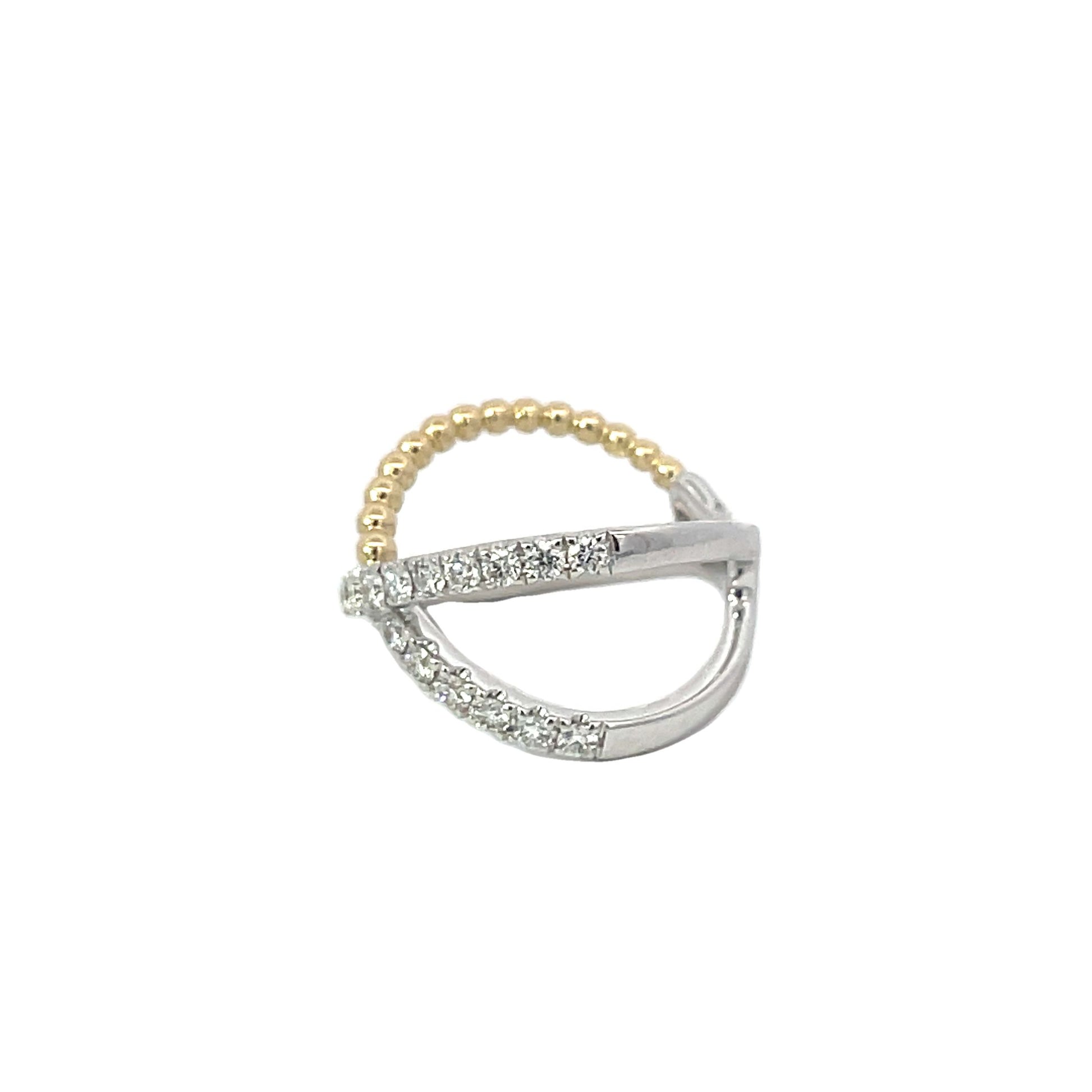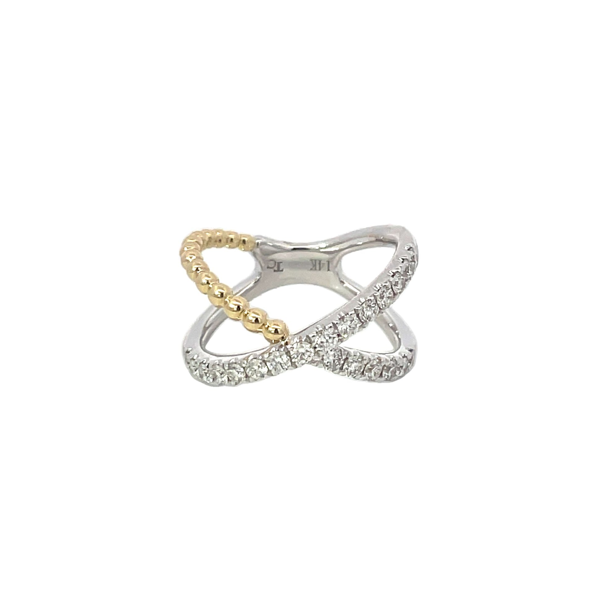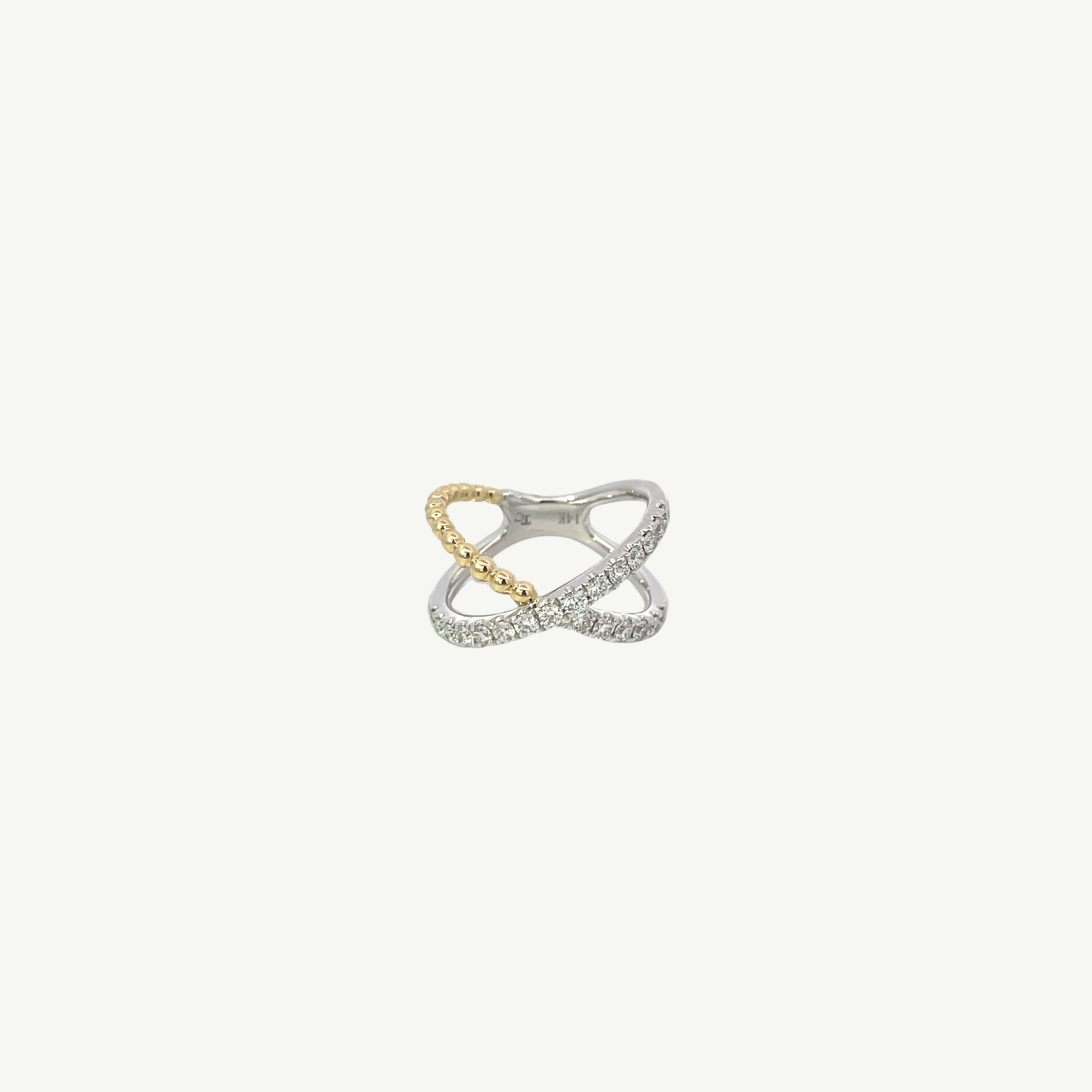 This elegant crossover ring features intricate beading and sparkling diamonds, creating a timeless and luxurious piece. The delicate design effortlessly combines sophistication and glamour, making it a perfect addition to any outfit. Adorn yourself with this exclusive ring and elevate your style.
