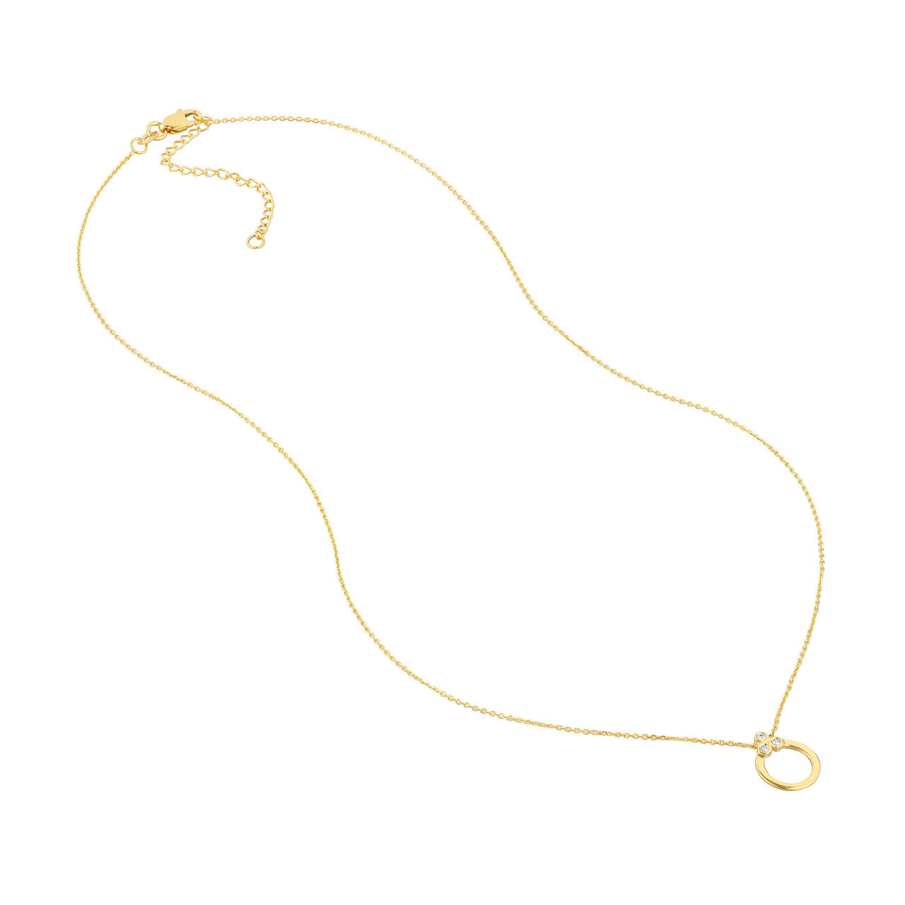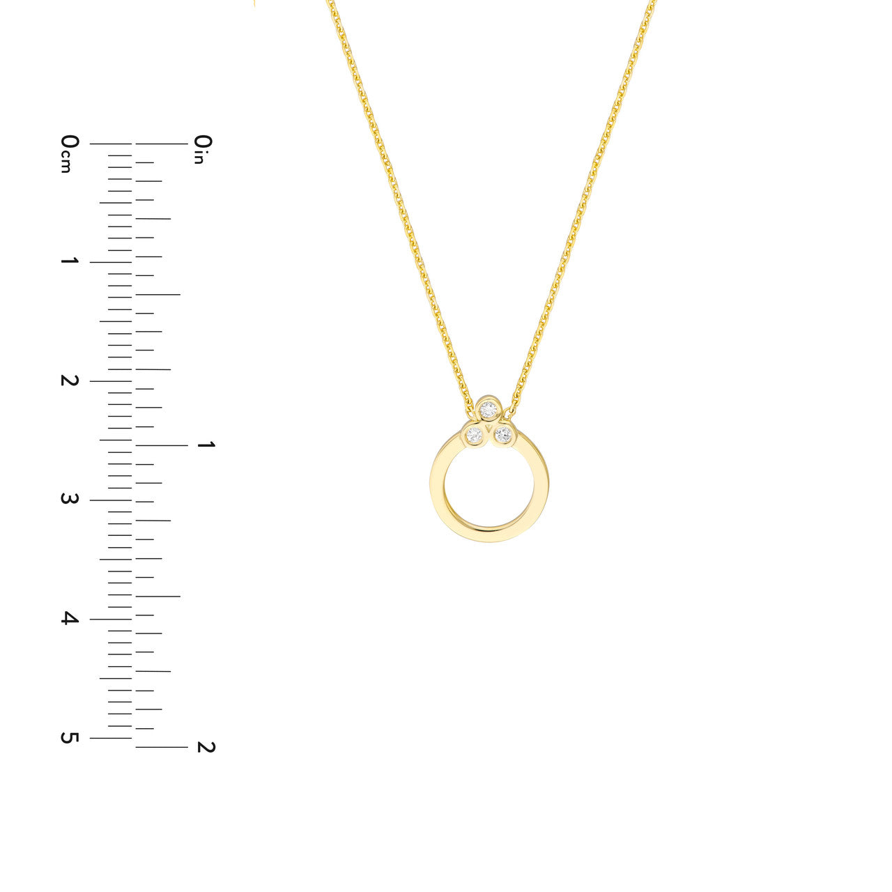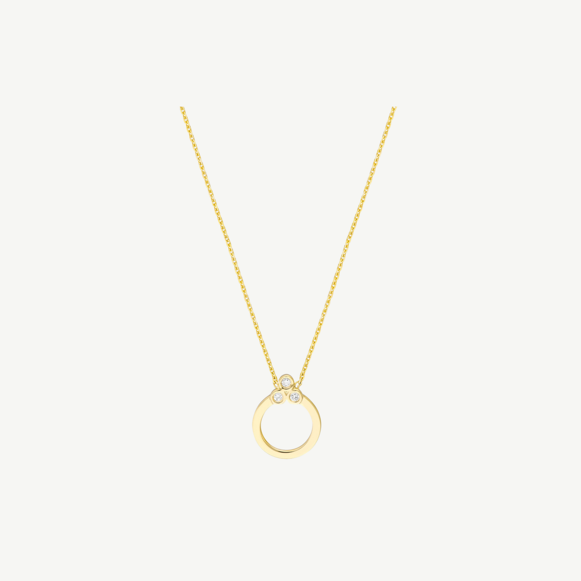 A bold statement in a small package. This mini open circle door knocker necklace with a 4pt diamond bezel trinity is perfect.