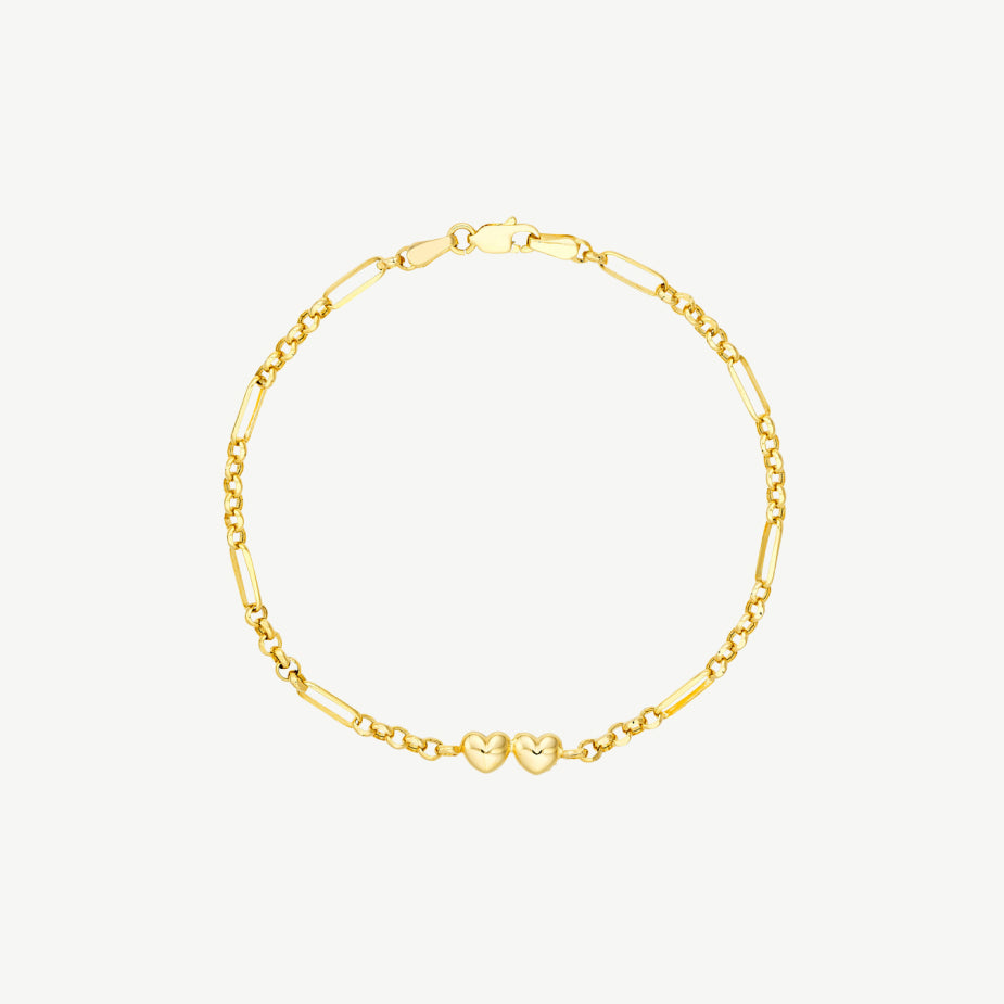 Two is better than one, especially in gold. A 14K gold paper clip bracelet with a double puff heart is a delightful addition to your wristwear.