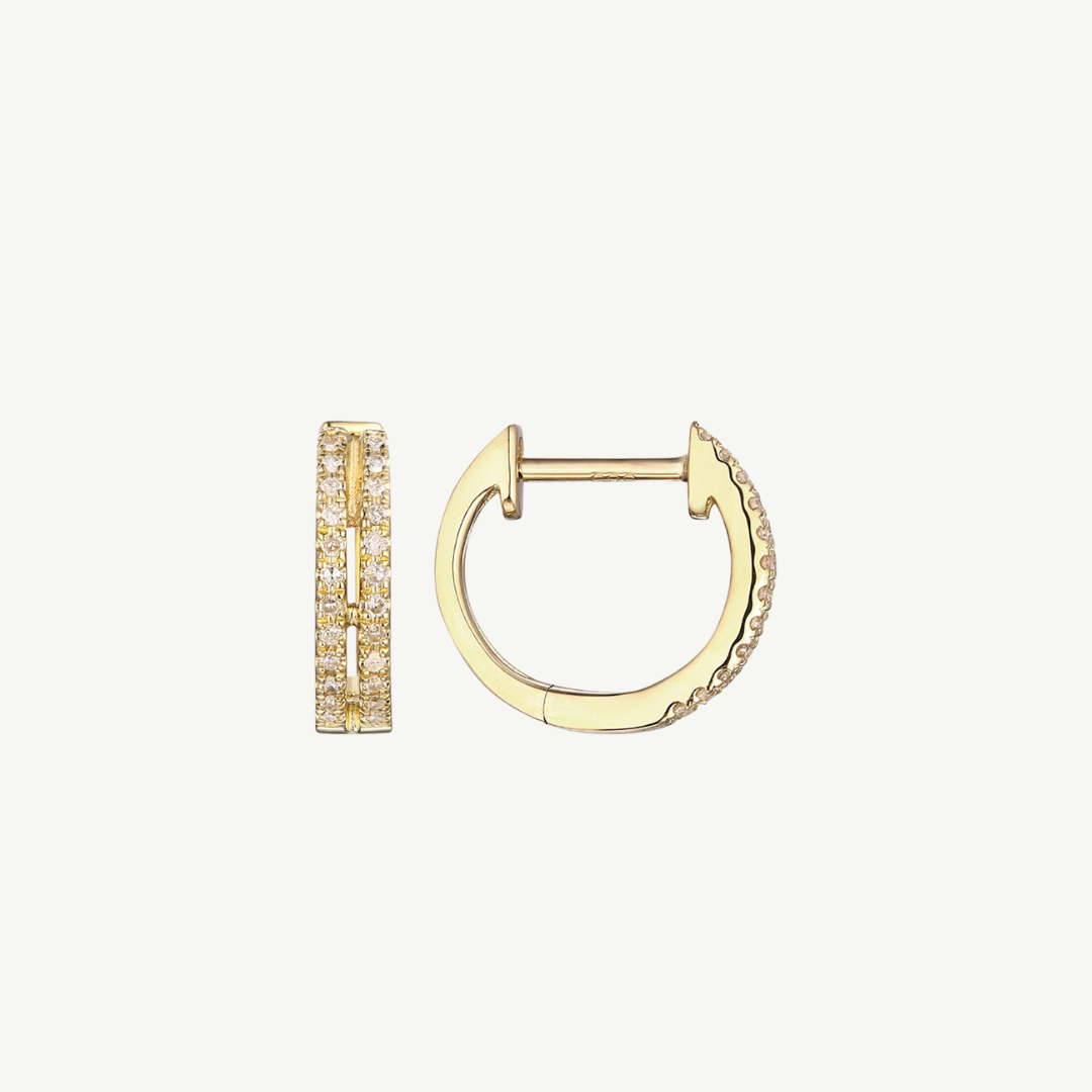 Indulge in luxurious elegance with our 14k Gold Double Row Diamond Huggy Earrings. Crafted with precision and adorned with sparkling diamonds, these earrings will add a touch of glamour and sophistication to any outfit. These stunning earrings are designed to captivate, featuring a double row of brilliant diamonds set in lustrous 14K gold. Each earring boasts 0.12 carats of dazzling diamonds, meticulously placed to catch the light with every movement, creating a mesmerizing sparkle.
