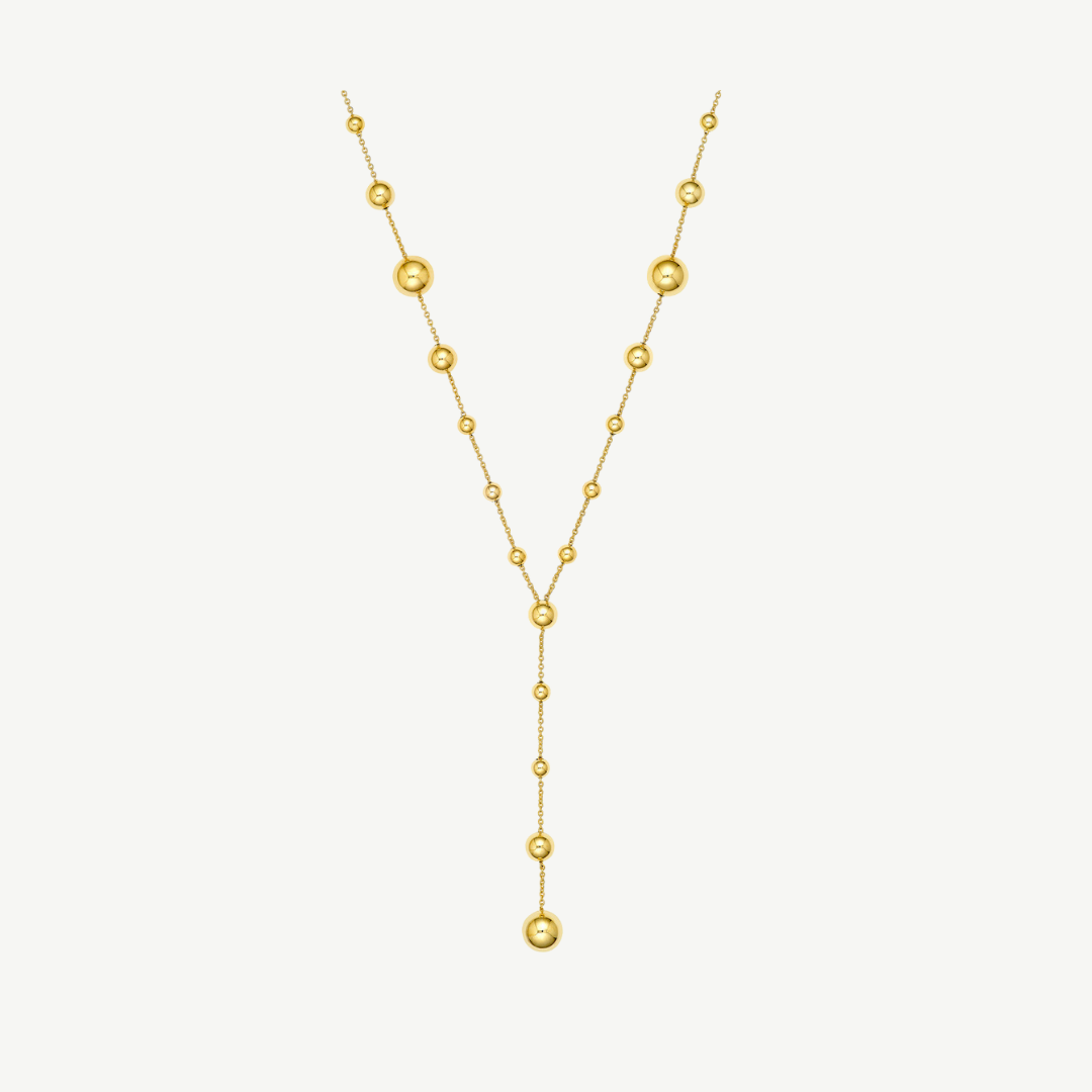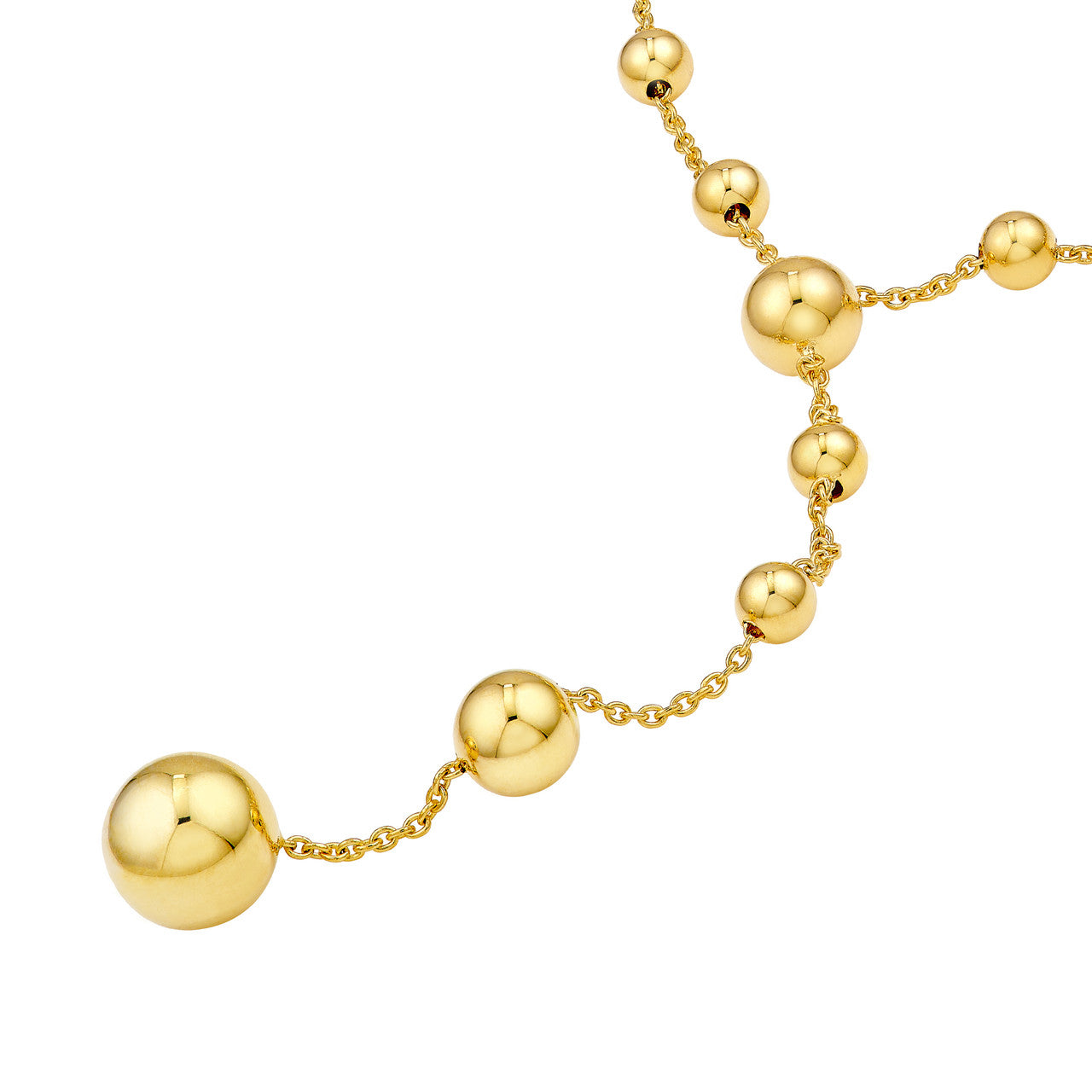 Elevate your style with the timeless charm of beads. This 14K solid gold lariat necklace features a pear shape lobster lock for secure closure and a 2-inch extender for added versatility.