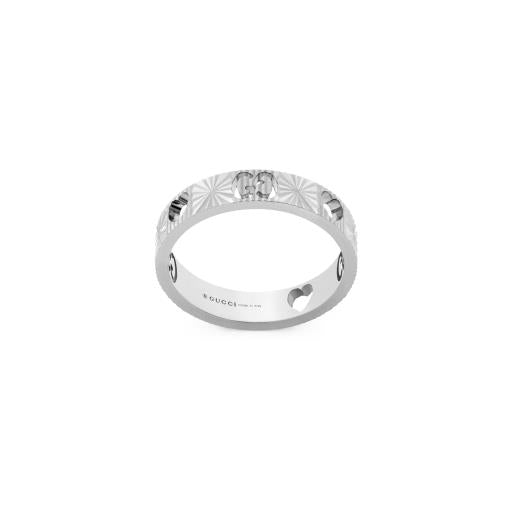 The latest silhouettes for the Icon line offer new refined and contemporary executions of signature pieces. Intricate engraved details offer a magical touch, such as the heart motif that continues to appear as a beloved symbol of the House alongside the emblematic GG motif. Here both symbols appear as part of this precious ring in 18k white gold.