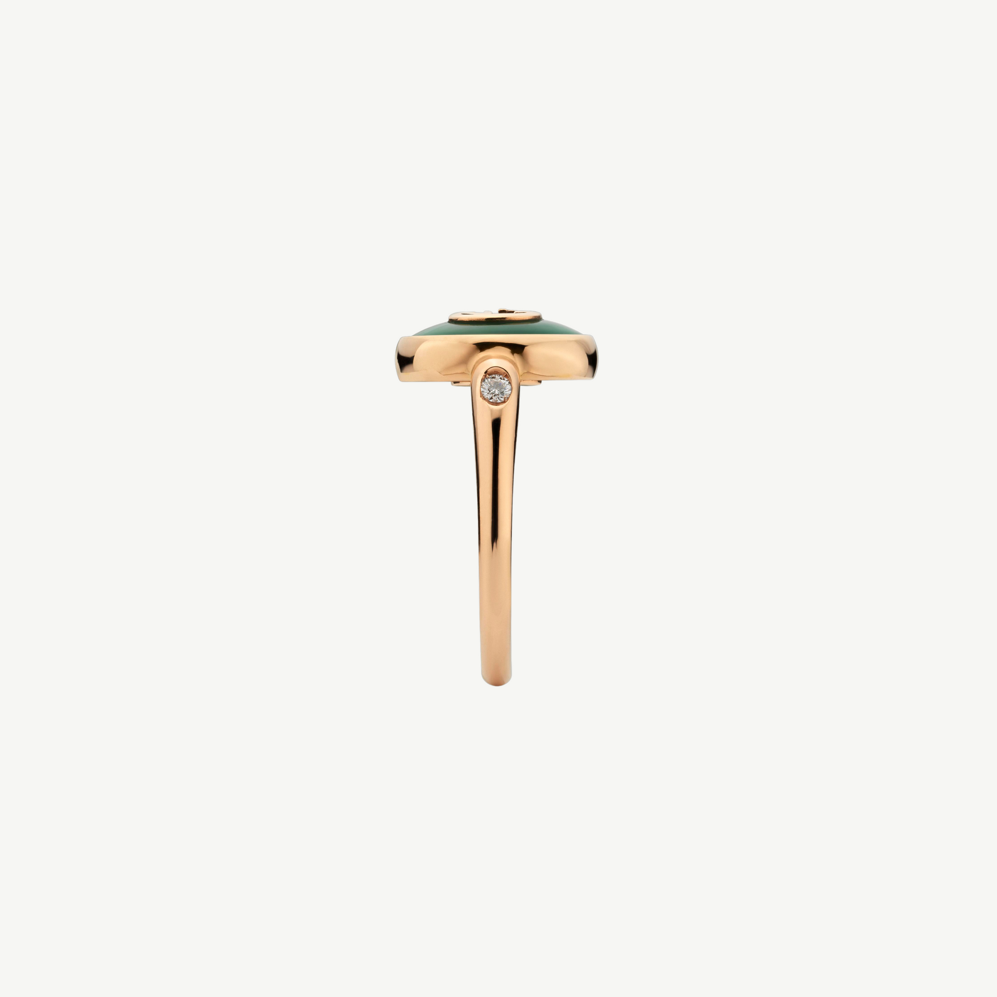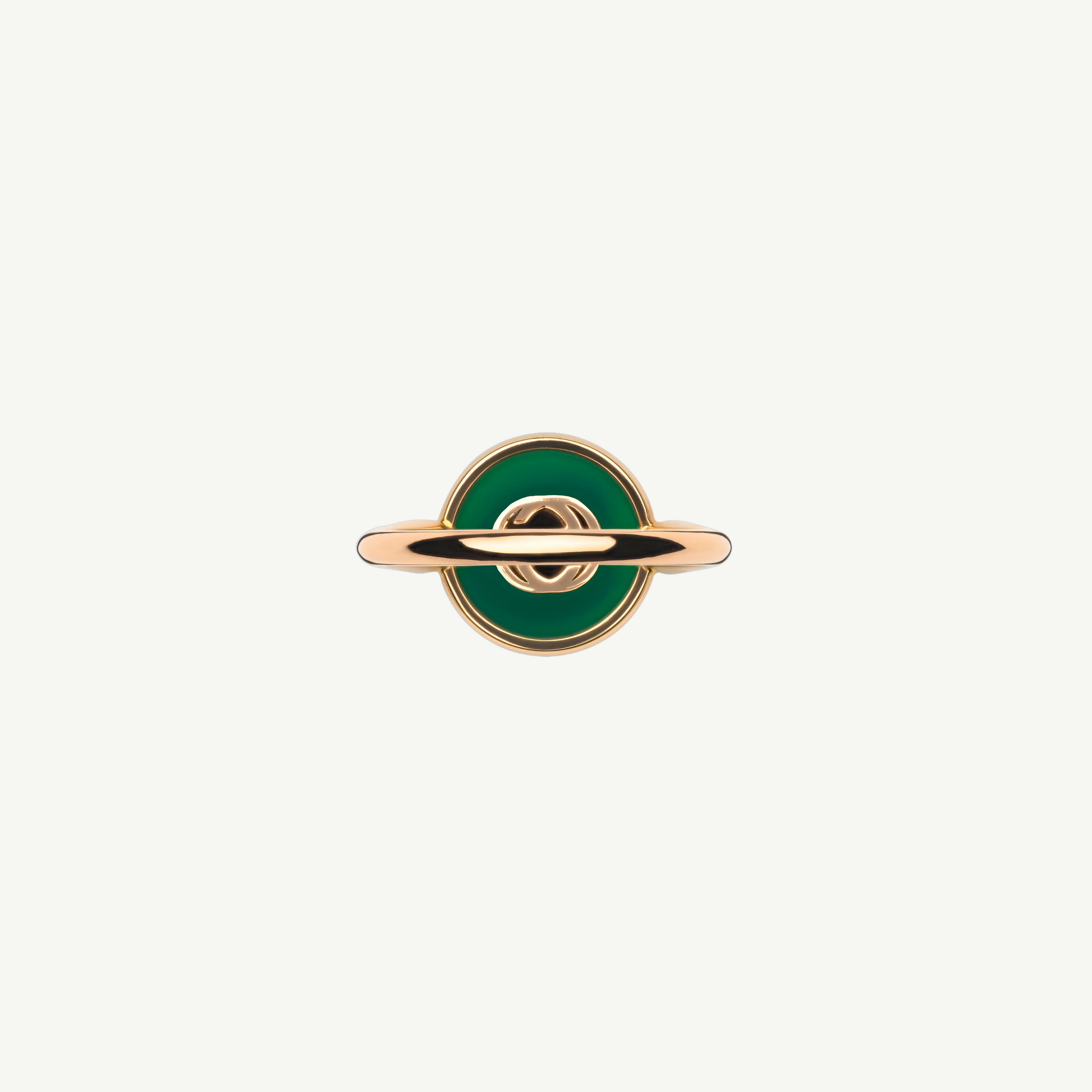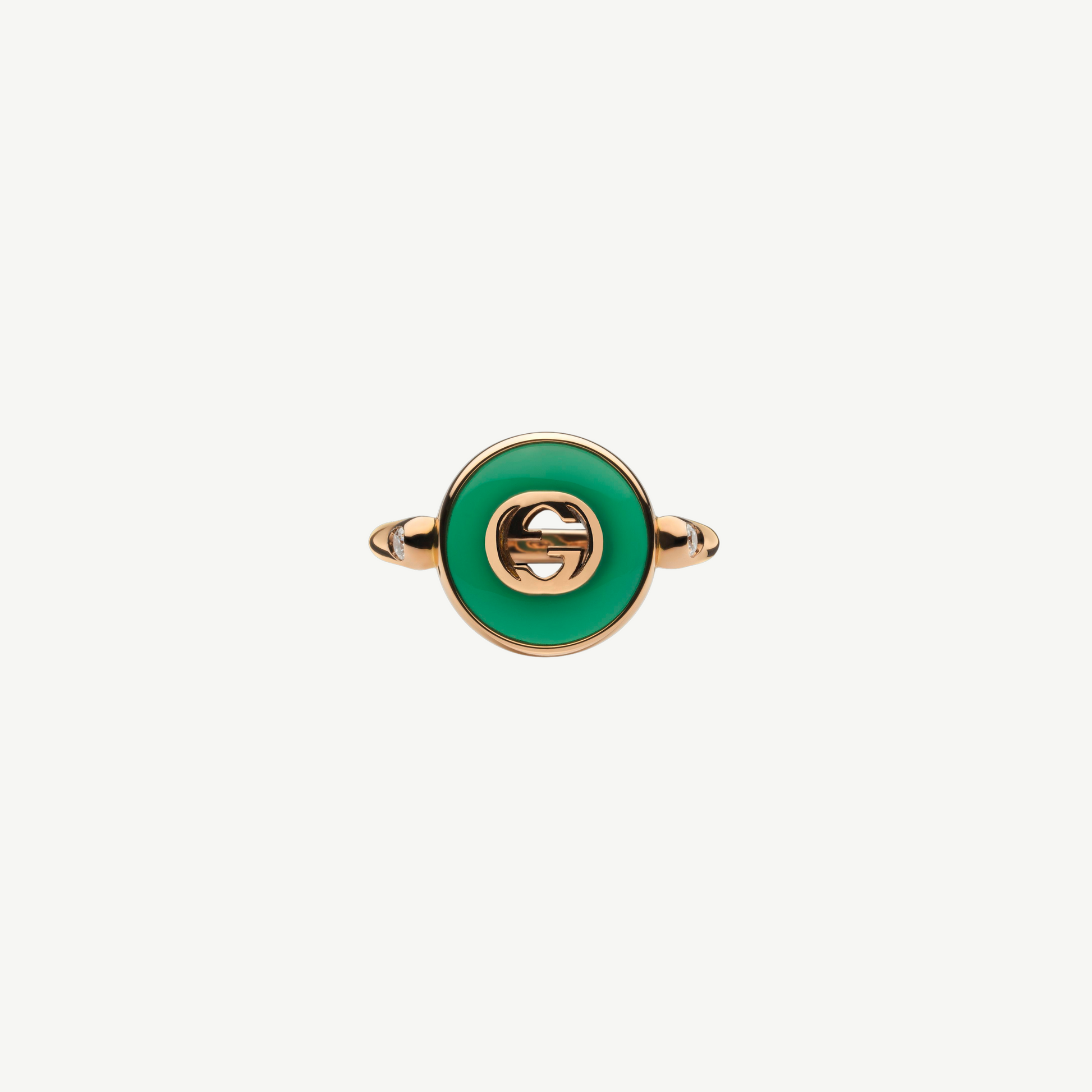 The Interlocking G logo appears in elegant new interpretations for Pre-Fall 2024. Refined rose gold is complemented by vivid green agate stone and sparkling diamonds. This ring can be matched with other accessories from the same line.