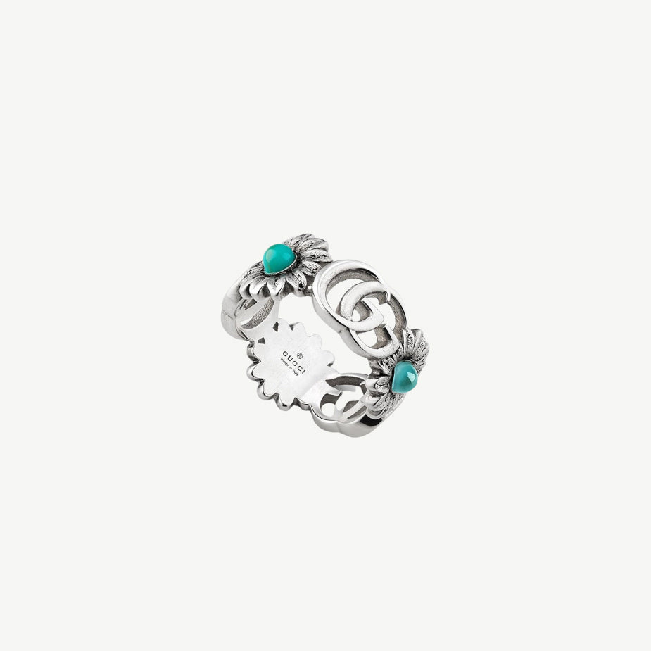 Experience the breathtaking beauty of this exquisite Gucci ring, adorned with a stunning floral motif crafted with luxurious mother of pearl, shimmering topaz, and vibrant turquoise resin.