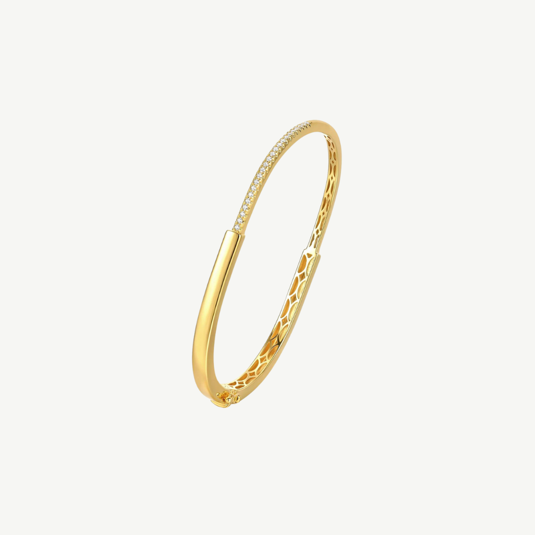 Indulge in the perfect blend of luxury and edginess with our stunning Handcuff Bangle, featuring a striking combination of gold and diamond accents.