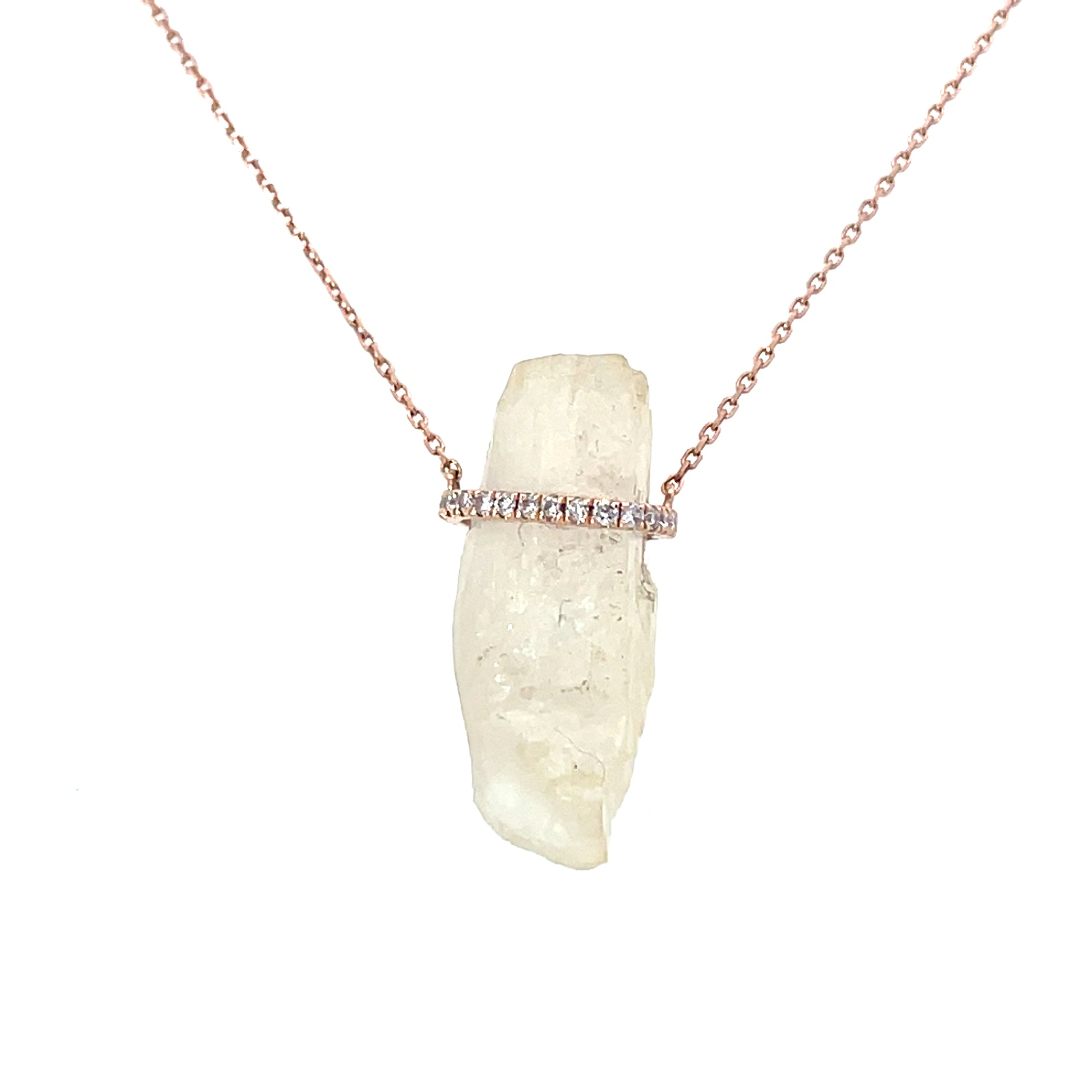 Capture the magic of moonstone with this enchanting 14K Rose gold pendant necklace, designed for those who seek both elegance and the healing power of crystals. The centerpiece is a beautifully raw moonstone crystal, wrapped in a delicate diamond-studded band for a subtle touch of sparkle. Moonstone, often referred to as the stone of intuition and emotional balance, is believed to bring calm, clarity, and protection to the wearer. Whether worn as a meaningful talisman or a statement of modern sophistication, this pendant necklace radiates natural beauty and positive energy, perfect for those drawn to crystal healing.