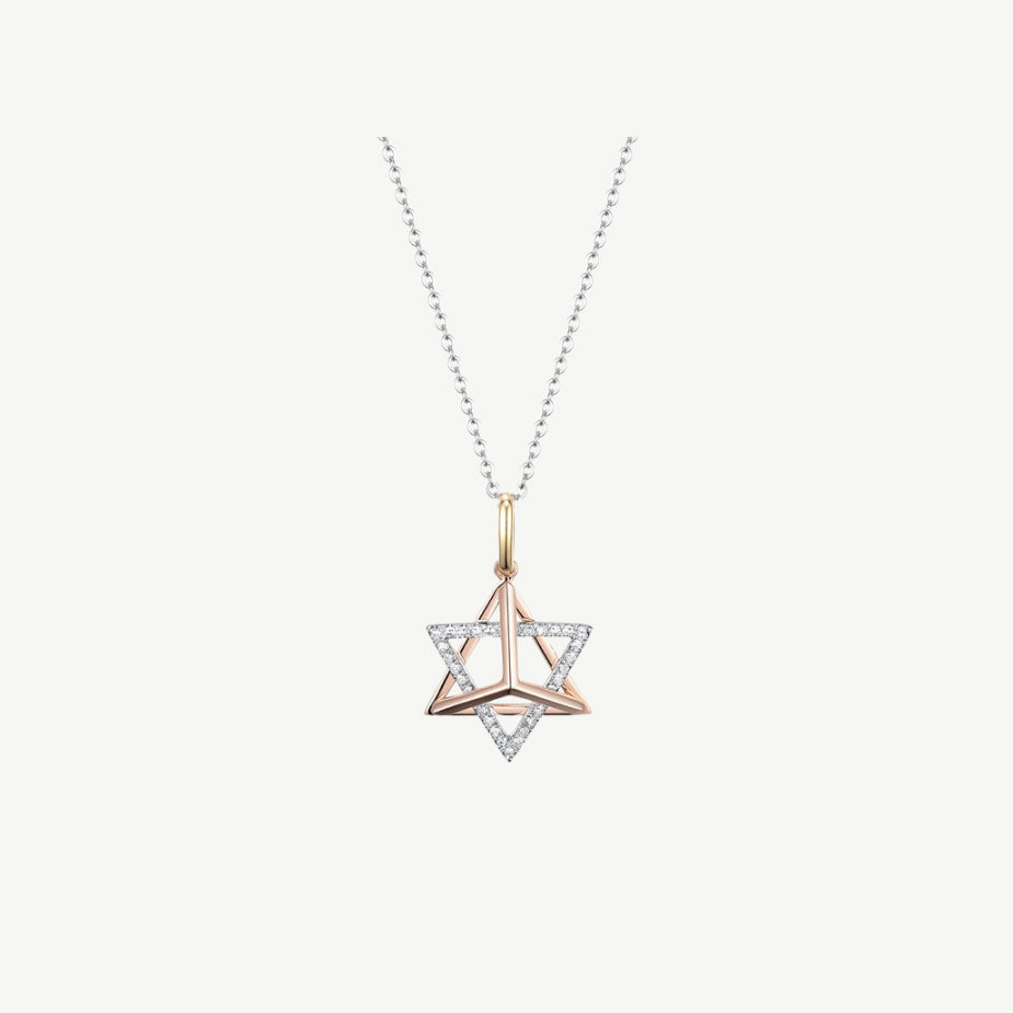 This necklace is in 14k white, rose and yellow gold and features round brilliant cut diamonds that total .10cts.
