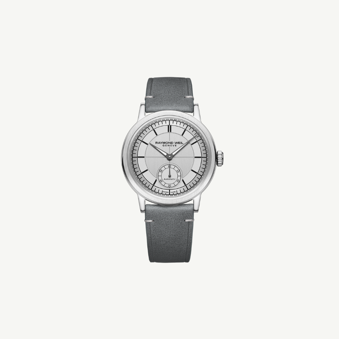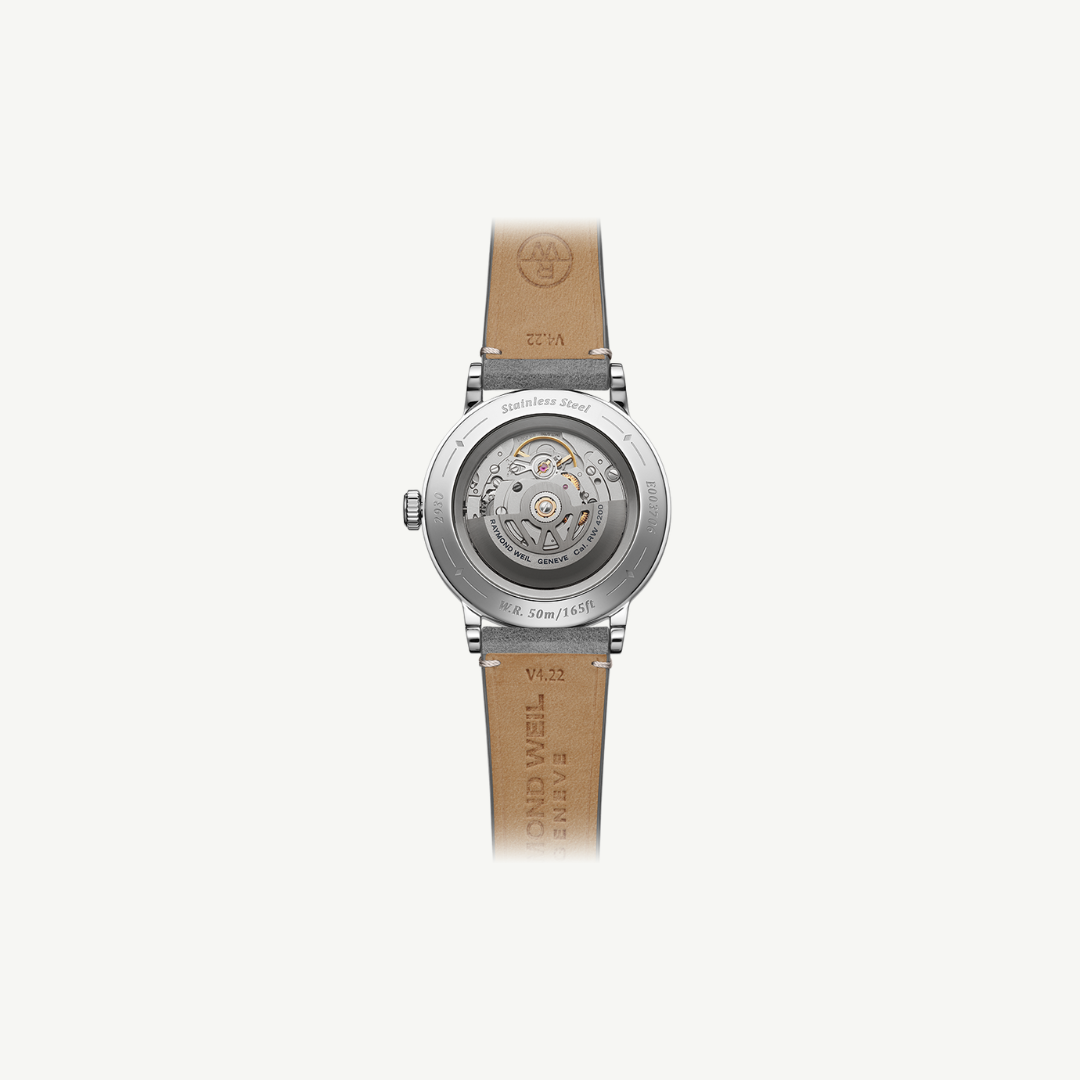 The bezel's vertical satin-brush contrasts with the highly polished bevel, highlighting the craftsmanship. The sapphire case back reveals the self-winding movement and Raymond Weil’s signature “W-shaped” oscillating weight. Complementing the timepiece, the genuine calf leather strap features a unique W-stitched detail. The collection embodies a grand vintage interpretation of the Raymond Weil brand, marrying classic elegance with contemporary functionality.