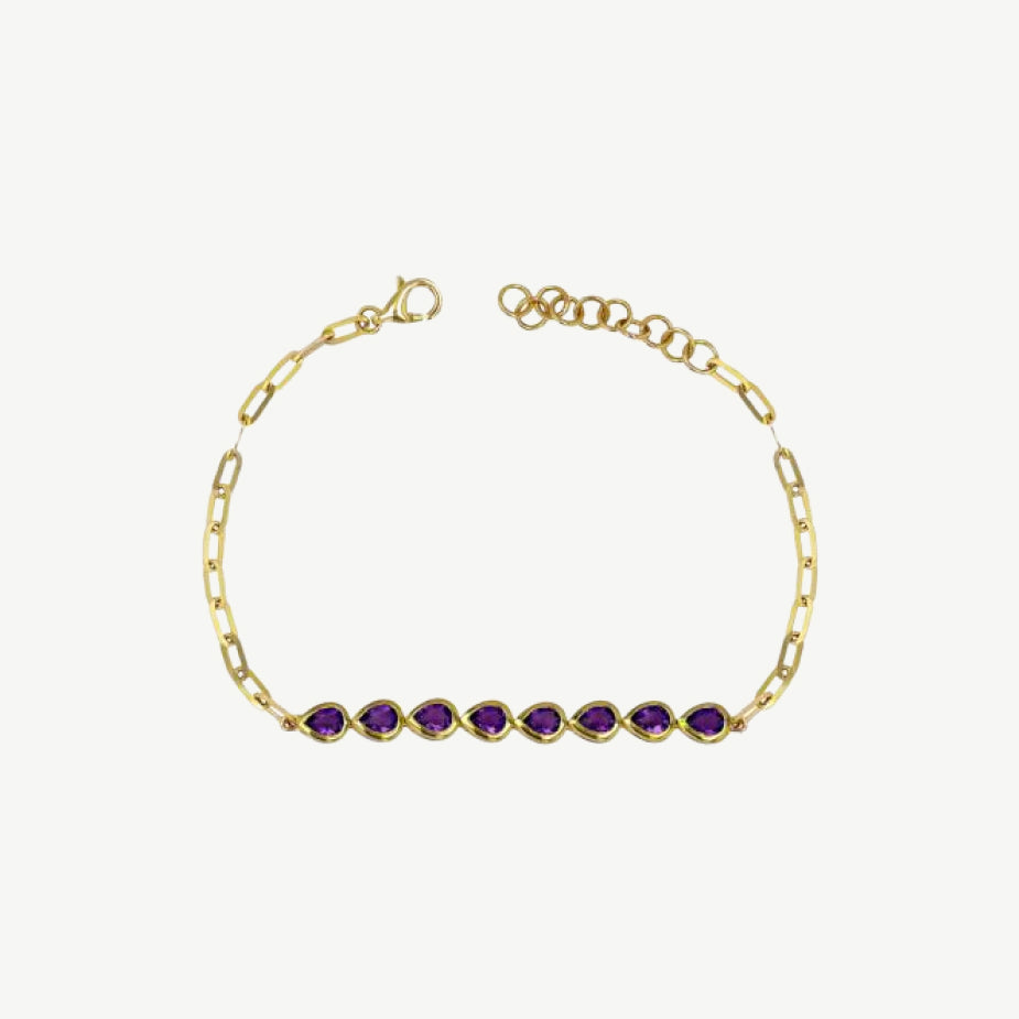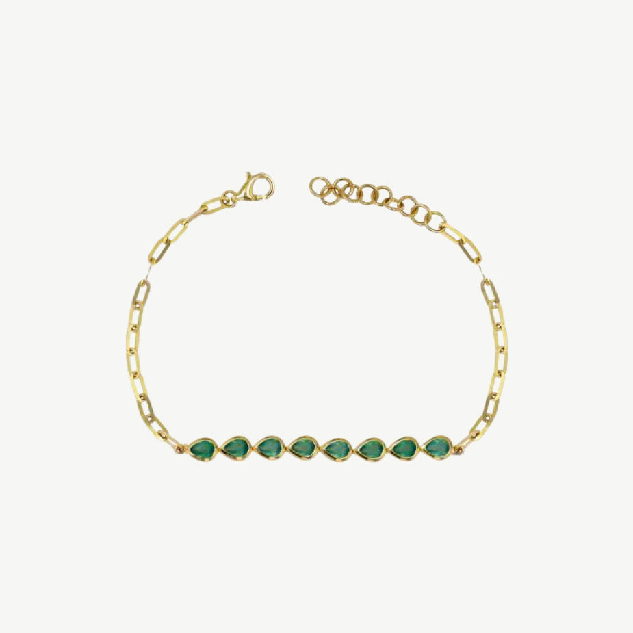 Dazzle with this colored gemstone bracelet featuring 8 pear-shaped stones on a delicate 14k gold paperclip chain. Elevate your style and channel positive energy with the natural beauty and unique design of this bracelet. A must-have addition to your jewelry collection.