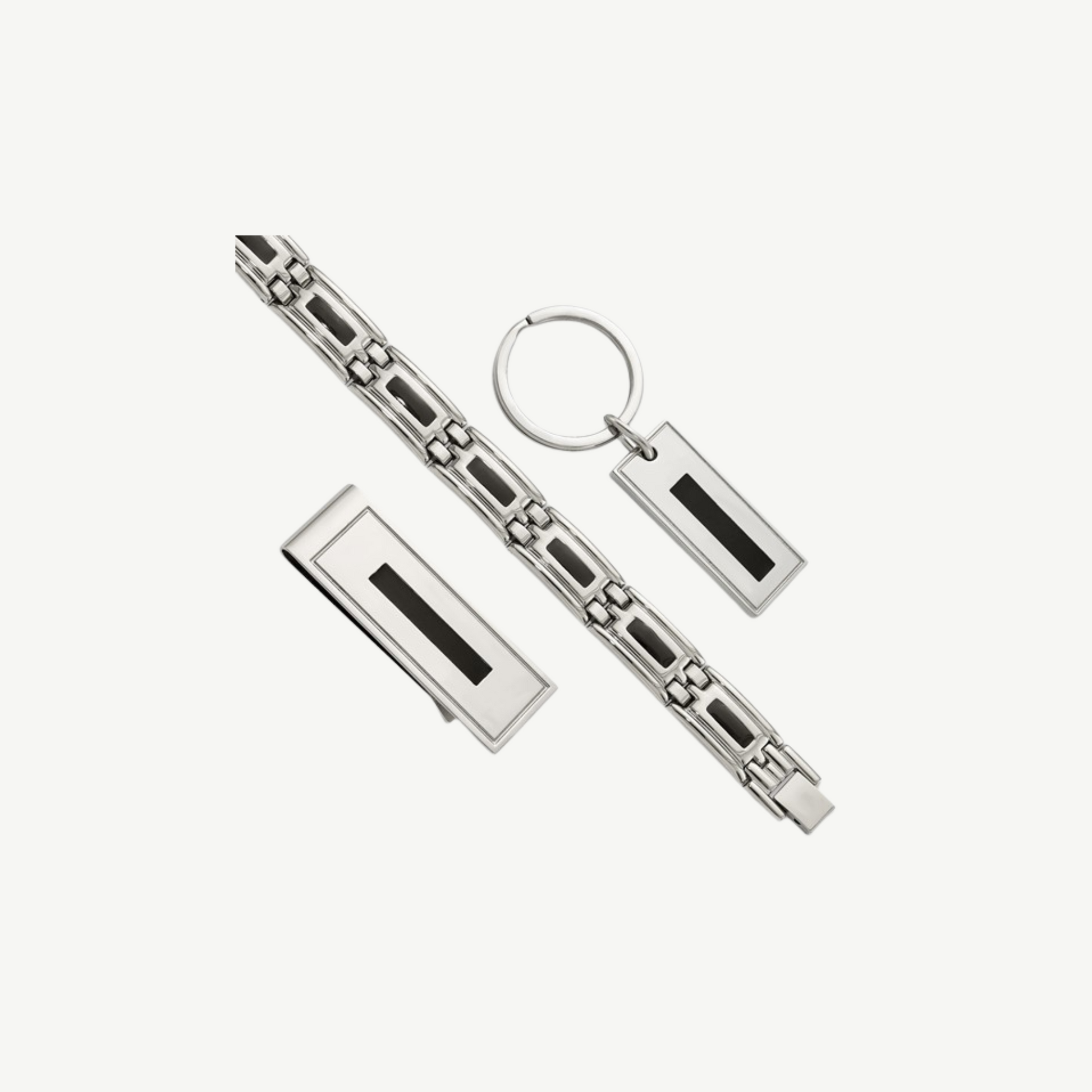 This Chisel set includes a stainless steel enameled bracelet, money clip, and key ring, all designed for a sleek and modern look. The polished finish gives each piece a sophisticated and refined touch. Ideal for everyday use, this set offers durability and style in a practical, coordinated design.