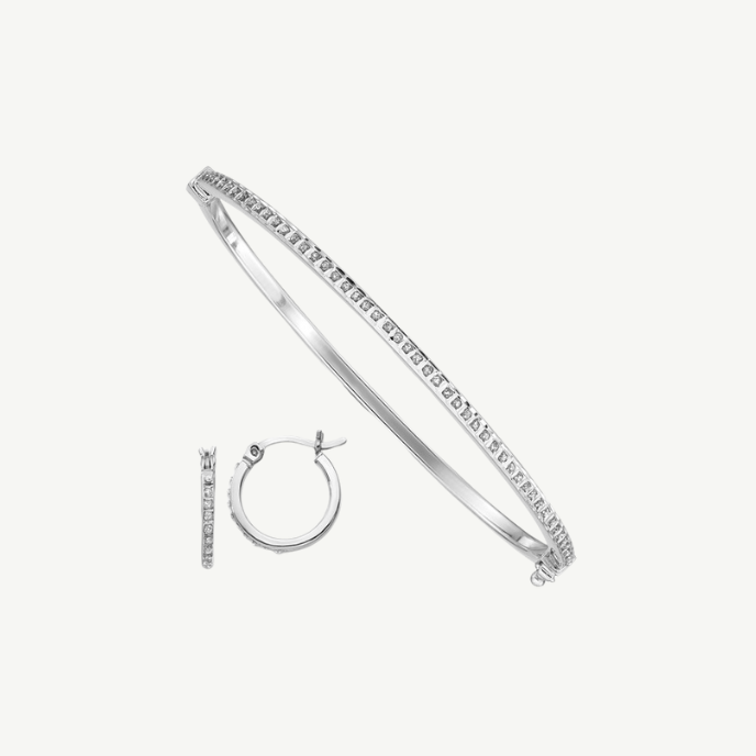 This elegant set includes sterling silver platinum-plated diamond hoop earrings and a hinged bangle, both featuring sparkling diamonds. The combination of sleek design and dazzling diamonds creates a luxurious, refined look. Perfect for elevating any outfit, this set is ideal for formal occasions or a touch of glamour every day.