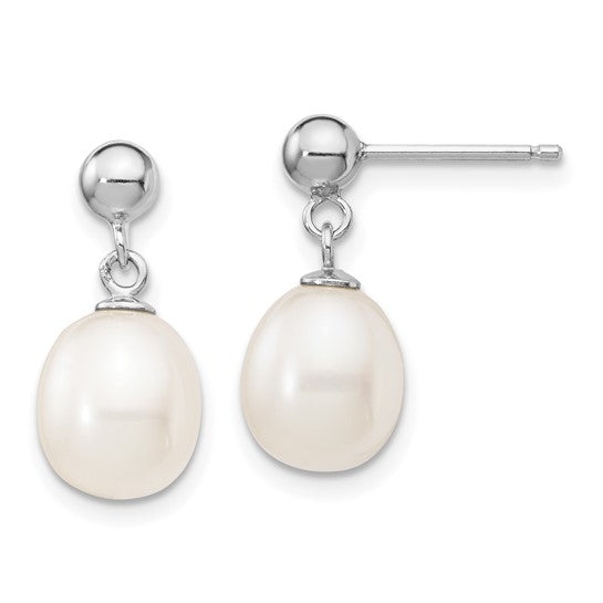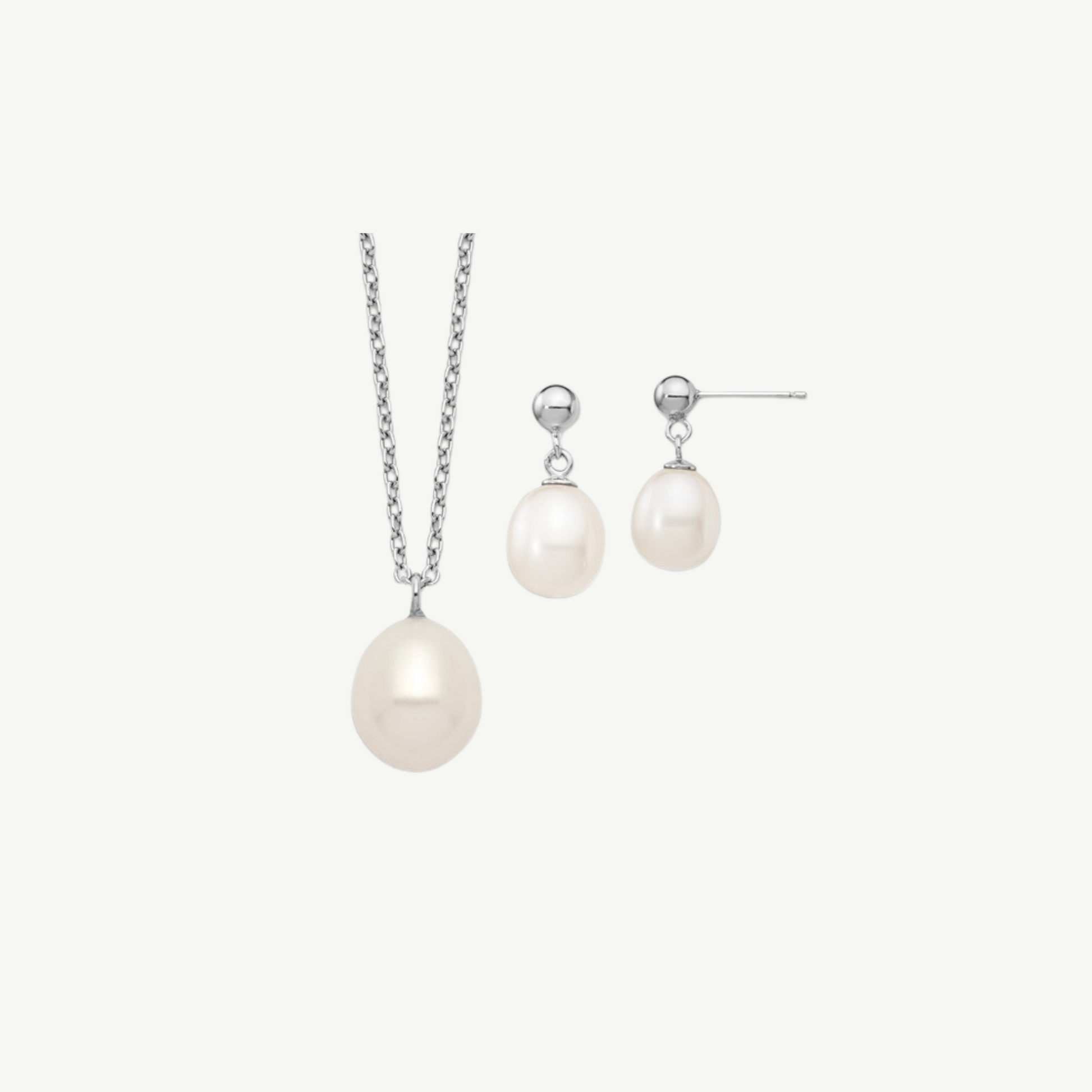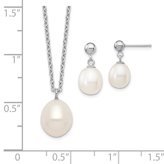 This elegant set features a beautiful 18-inch necklace and matching post dangle earrings, each adorned with 8-9mm white rice freshwater cultured pearls for a sophisticated, timeless look. The pieces are crafted in sterling silver and rhodium-plated for a brilliant, durable shine that enhances the natural luster of the pearls. Perfect for adding a refined touch to any outfit, this set effortlessly transitions from day to evening wear with its versatile and classic design
