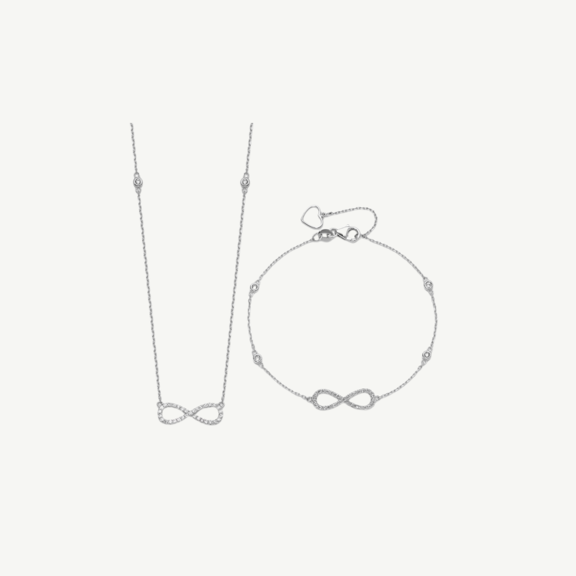 This elegant set features a sterling silver rhodium-plated bracelet and necklace, each adorned with a dazzling infinity symbol set with sparkling cubic zirconia stones. The timeless infinity design symbolizes endless love and connection, making this set a meaningful and sophisticated gift for any occasion. Perfect for adding a touch of elegance to both everyday outfits and formal looks, this set combines beauty and sentiment in a stunning, wearable design