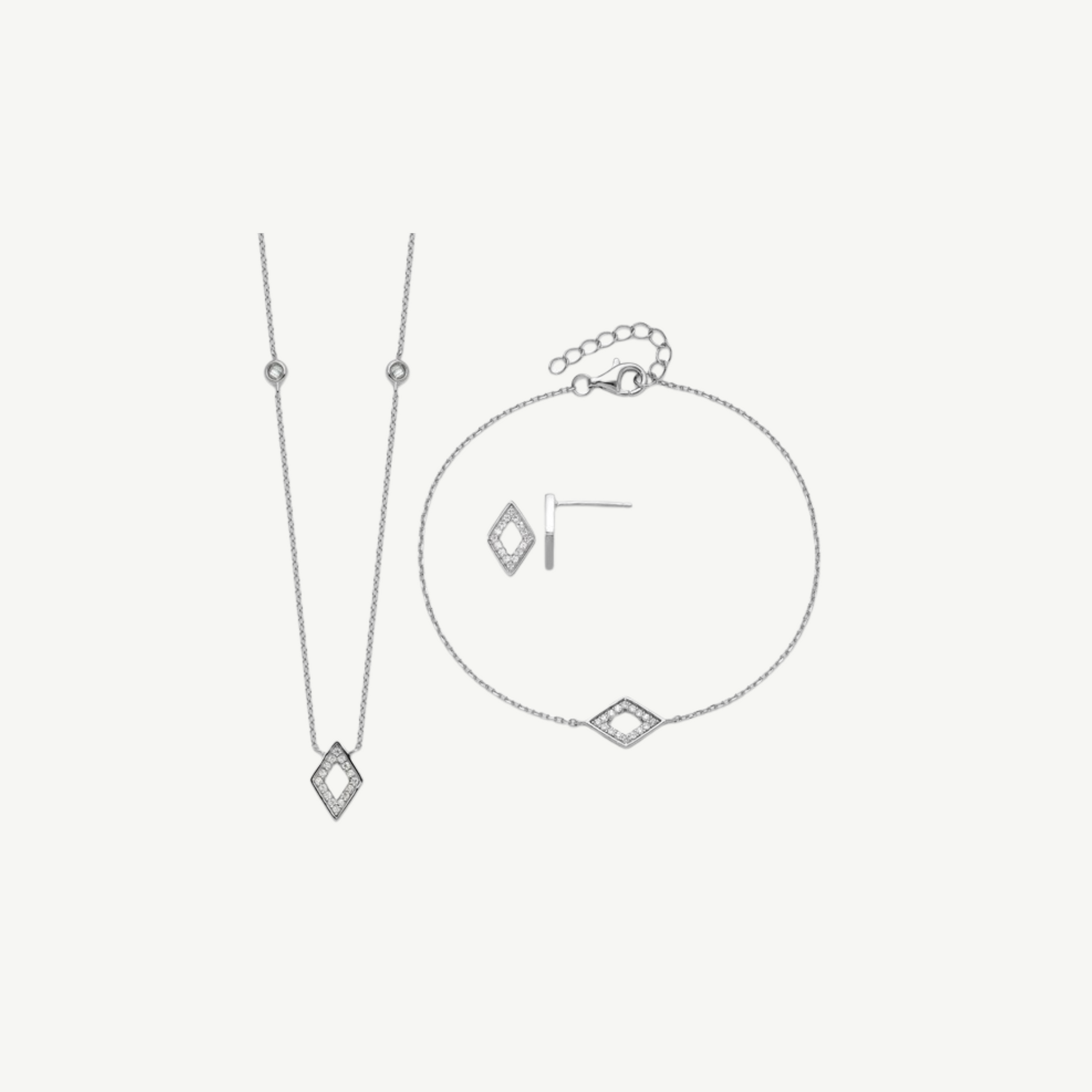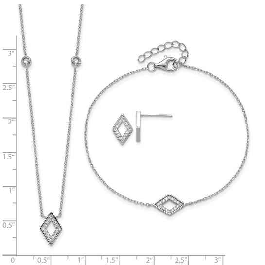 This stunning set includes a 7-inch bracelet, 18-inch necklace, and matching post earrings, all crafted from sterling silver and rhodium-plated for a brilliant, long-lasting shine. Each piece is embellished with sparkling cubic zirconia stones, offering a luxurious and eye-catching sparkle that complements both formal and casual looks. Perfect for any special occasion or as an elegant everyday accessory, this set adds a refined touch to your jewelry collection