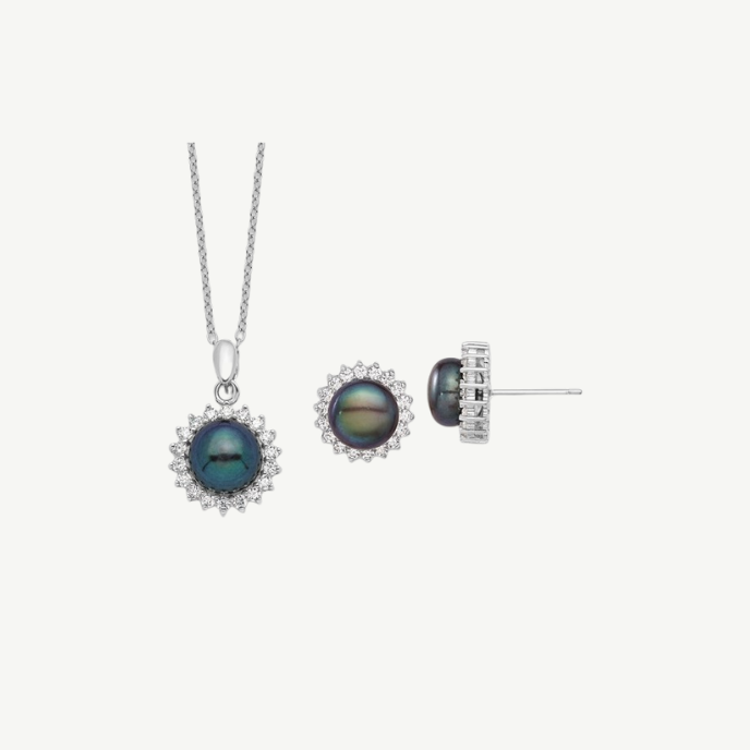 This elegant set features a 17-inch necklace and matching post earrings, both showcasing 8-9mm black button freshwater cultured pearls. The pieces are crafted from rhodium-plated sterling silver and accented with cubic zirconia for added sparkle. Perfect for adding sophistication and a touch of luxury to any occasion.
