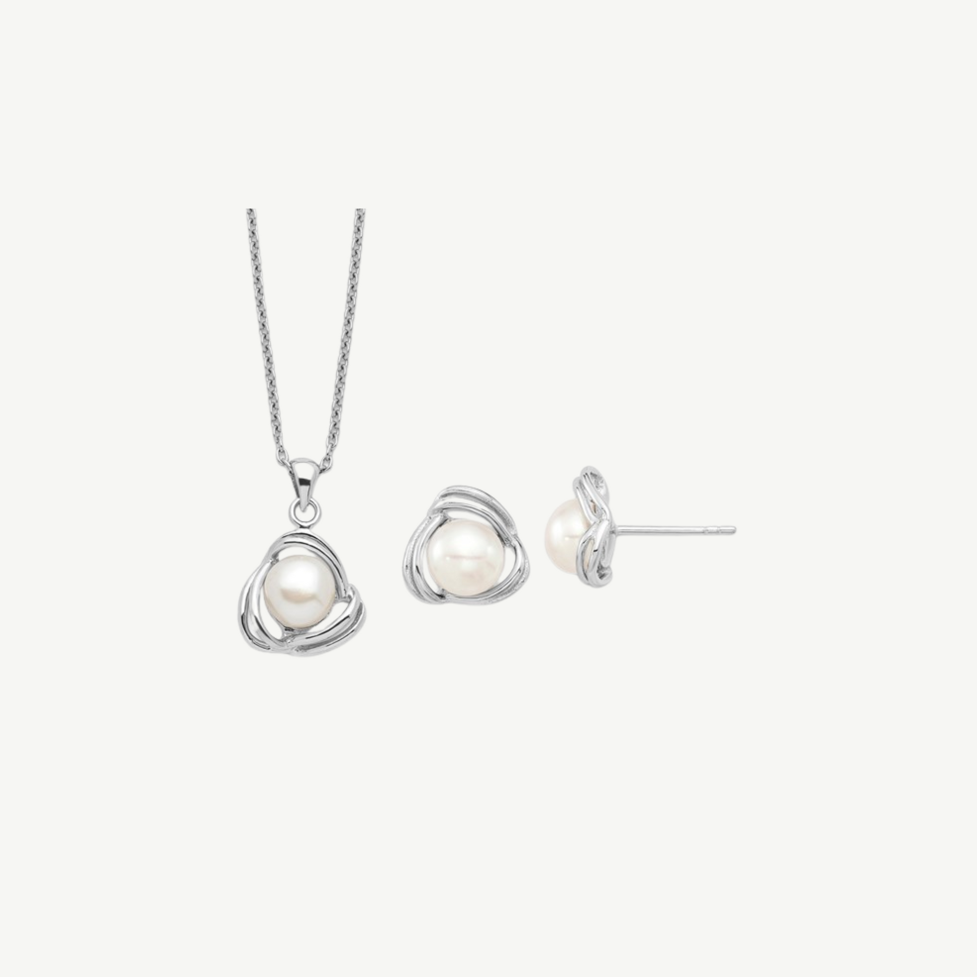 This elegant set features a 17-inch necklace and matching post earrings, each adorned with 6-7mm white button freshwater cultured pearls. The sterling silver pieces are rhodium-plated, offering a polished, shiny finish that complements the pearls' natural beauty. Perfect for any occasion, this timeless set adds sophistication and grace to any jewelry collection.