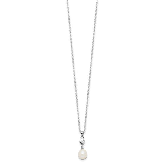 This stunning set features a 17-inch necklace and matching post dangle earrings, both accented with 7-8mm white teardrop freshwater cultured pearls. The rhodium-plated sterling silver setting is complemented by cubic zirconia stones, adding sparkle and elegance. Perfect for special occasions, this set offers a refined and timeless look.
