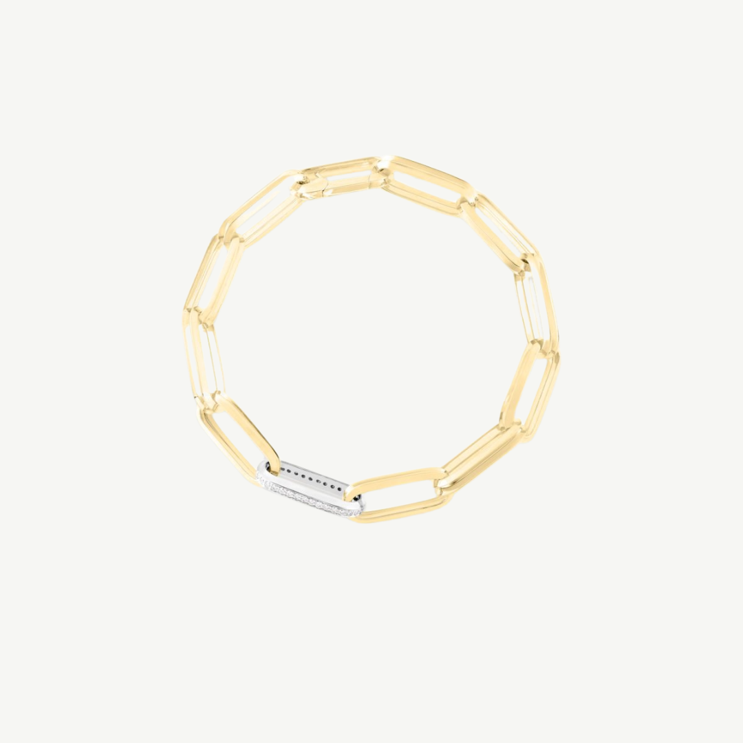 Introducing the 18K Yellow/White Gold and Diamond Rectangular Paperclip Link Bracelet by Roberto Coin. This stunning bracelet showcases a unique concave link design in rich 18K yellow gold, adding depth and dimension to your wrist. Measuring approximately 8 inches in length, it features an exquisite 18K white gold station adorned with sparkling round brilliant cut diamonds totaling 0.25 carats. Perfect for layering or making a statement on its own, this bracelet is a chic addition to any fine jewelry collection.
