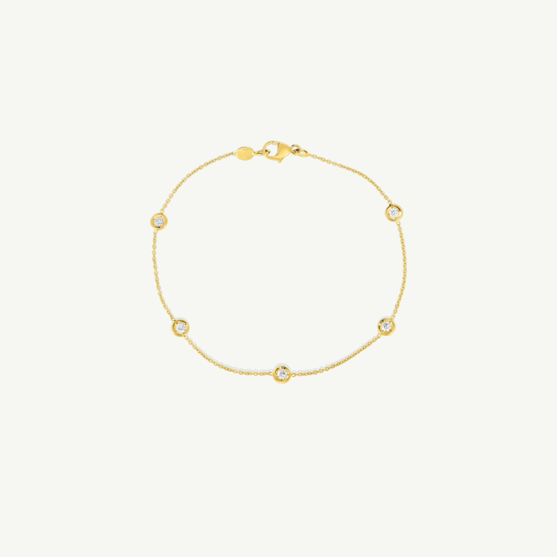 The Roberto Coin 18K Yellow Gold Diamond By The Inch 5 Station Bracelet features a chic design adorned with five shimmering diamond stations. Crafted from luxurious 18K yellow gold, this bracelet adds a radiant touch to any jewelry collection. Its elegant yet versatile style makes it perfect for both everyday wear and special occasions.