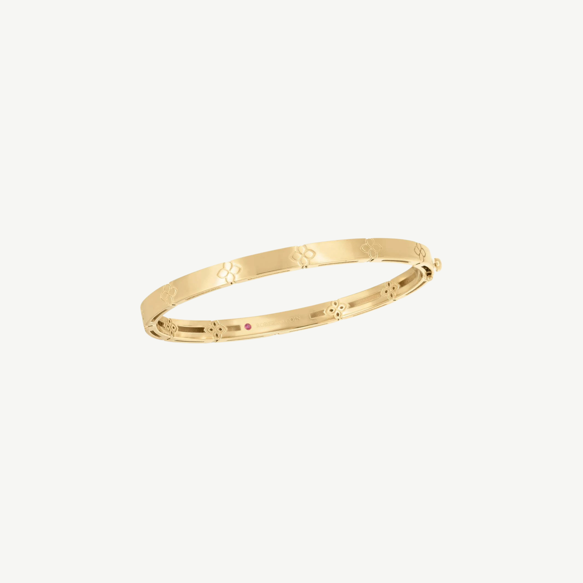 The Roberto Coin 18K Yellow Gold Love in Verona Narrow Bangle exudes sophistication and timeless elegance. This beautifully crafted bangle features a sleek, minimalist design that highlights the warm tones of 18K yellow gold, making it a versatile piece for any occasion. Ideal for stacking or wearing alone, it adds a refined touch to your jewelry collection while embodying the romantic spirit of the Love in Verona collection.
