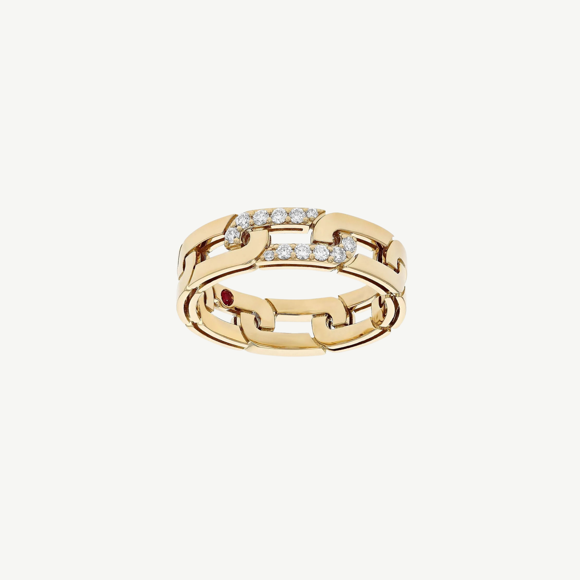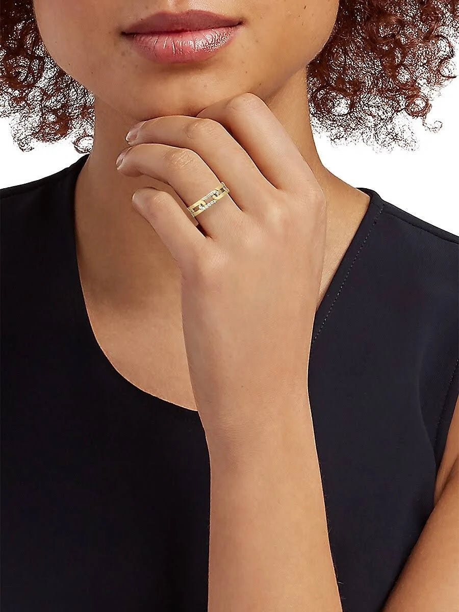 The Roberto Coin 18K Yellow Gold Navarra Diamond-Accented Slim Ring beautifully combines modern elegance with a touch of sparkle. This exquisite piece features a delicate design enhanced by shimmering diamonds, creating a luxurious statement while maintaining a minimalist appeal. Perfect for stacking or wearing alone, this ring is an ideal accessory for both everyday wear and special occasions, reflecting a timeless sense of style.