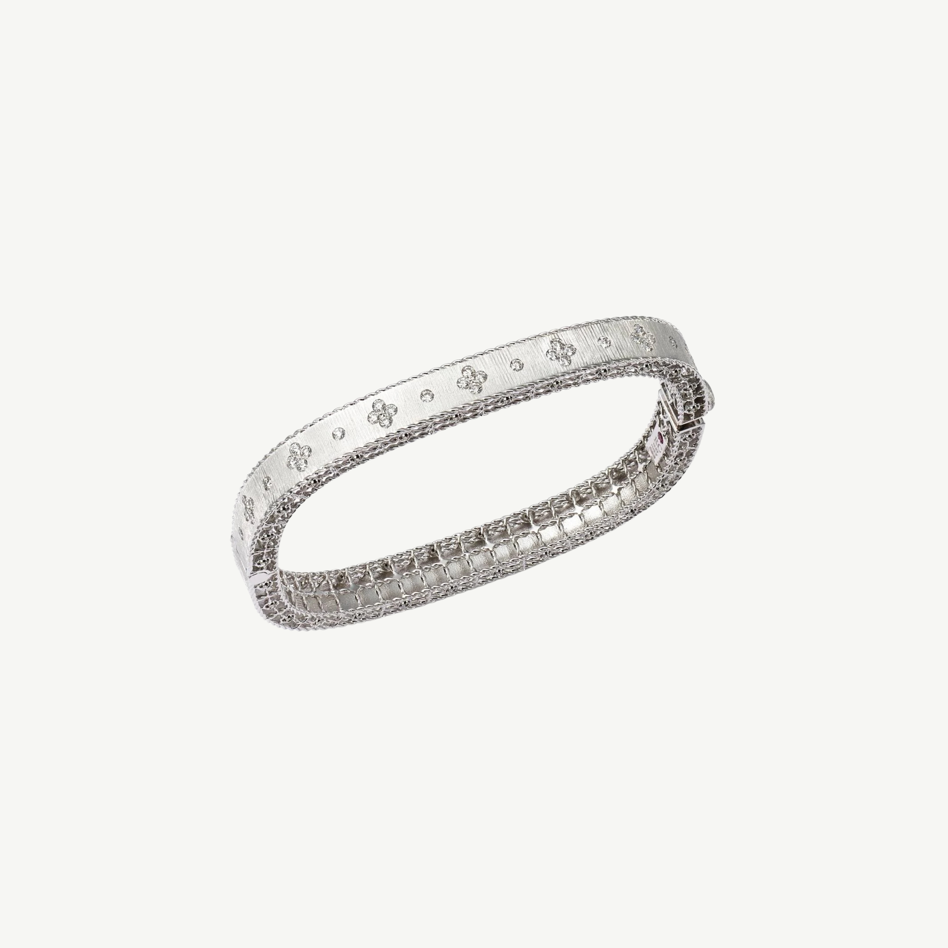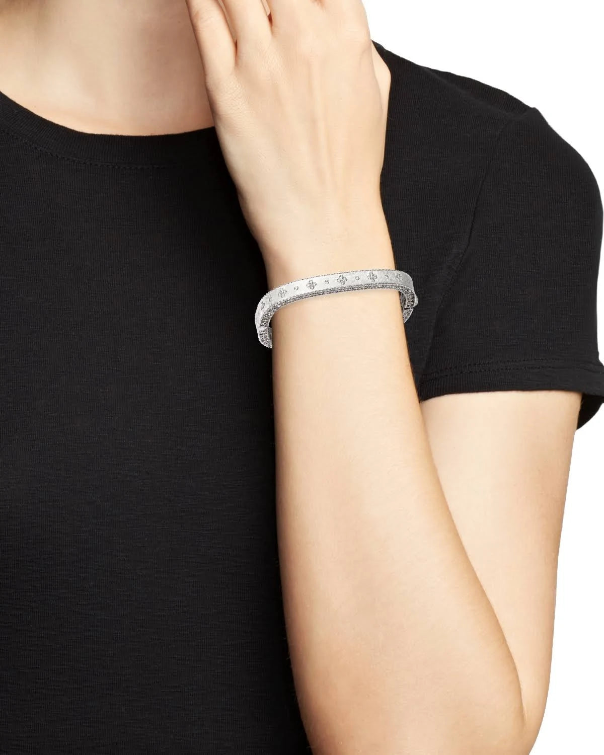 The Satin Finish Slim Bangle by Roberto Coin features a sleek design adorned with elegant Fleur-de-Lis motifs, symbolizing beauty and perfection. Crafted with a luxurious satin finish, this piece is both modern and timeless, making it an exquisite addition to any jewelry collection. The bangle is enhanced with sparkling diamonds, adding a touch of sophistication and sparkle to its understated charm.