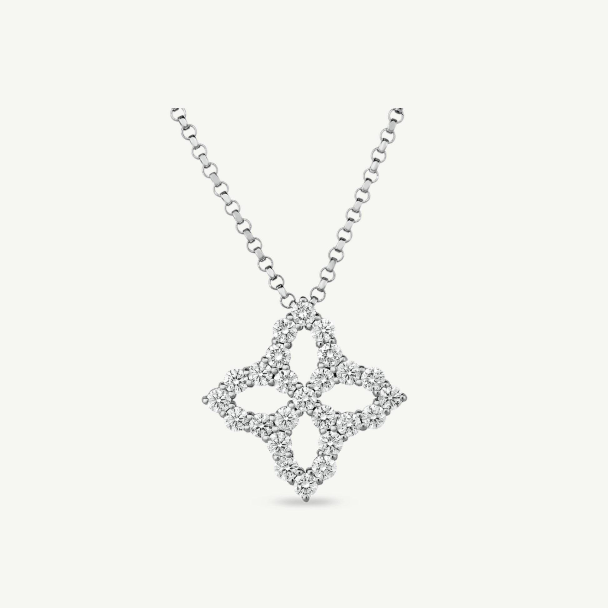 The Roberto Coin Princess Flower Medium Pendant features an 18k white gold design accented by delicate diamonds, showcasing the brand's signature floral motif. This elegant piece combines timeless Italian craftsmanship with modern luxury, making it ideal for special occasions or sophisticated everyday wear. The pendant’s subtle sparkle and intricate details highlight Roberto Coin's commitment to fine jewelry artistry.
