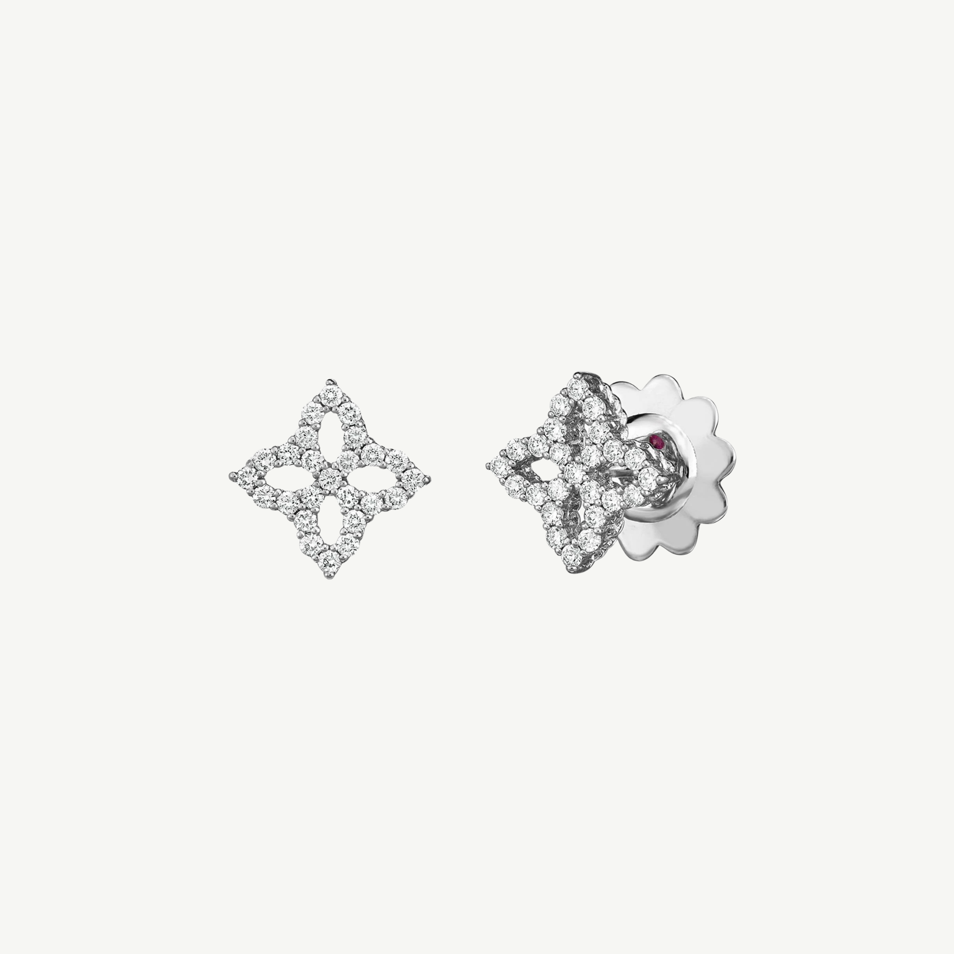 The Roberto Coin Princess Flower Small Open Stud Earrings are crafted in 18k white gold and feature 0.32 carats of brilliant diamonds, highlighting the brand’s signature floral design. These elegant studs showcase an open flower motif, adding a touch of sophistication and timeless beauty to any outfit. Perfect for both everyday wear and special occasions, they exemplify Roberto Coin’s dedication to exquisite craftsmanship and luxurious style.
