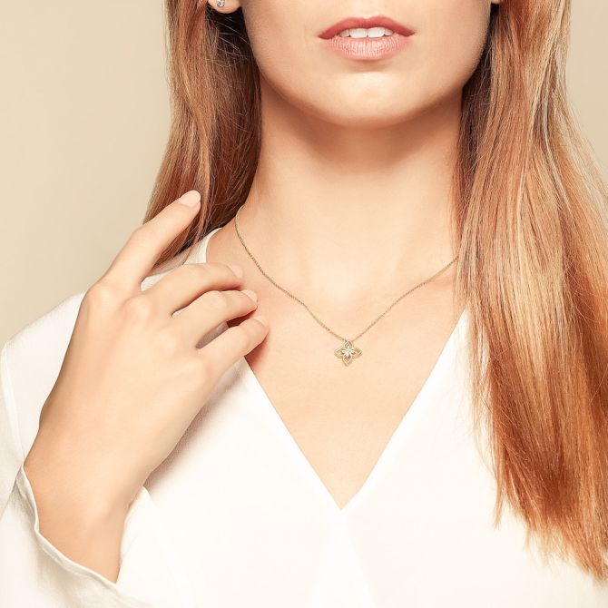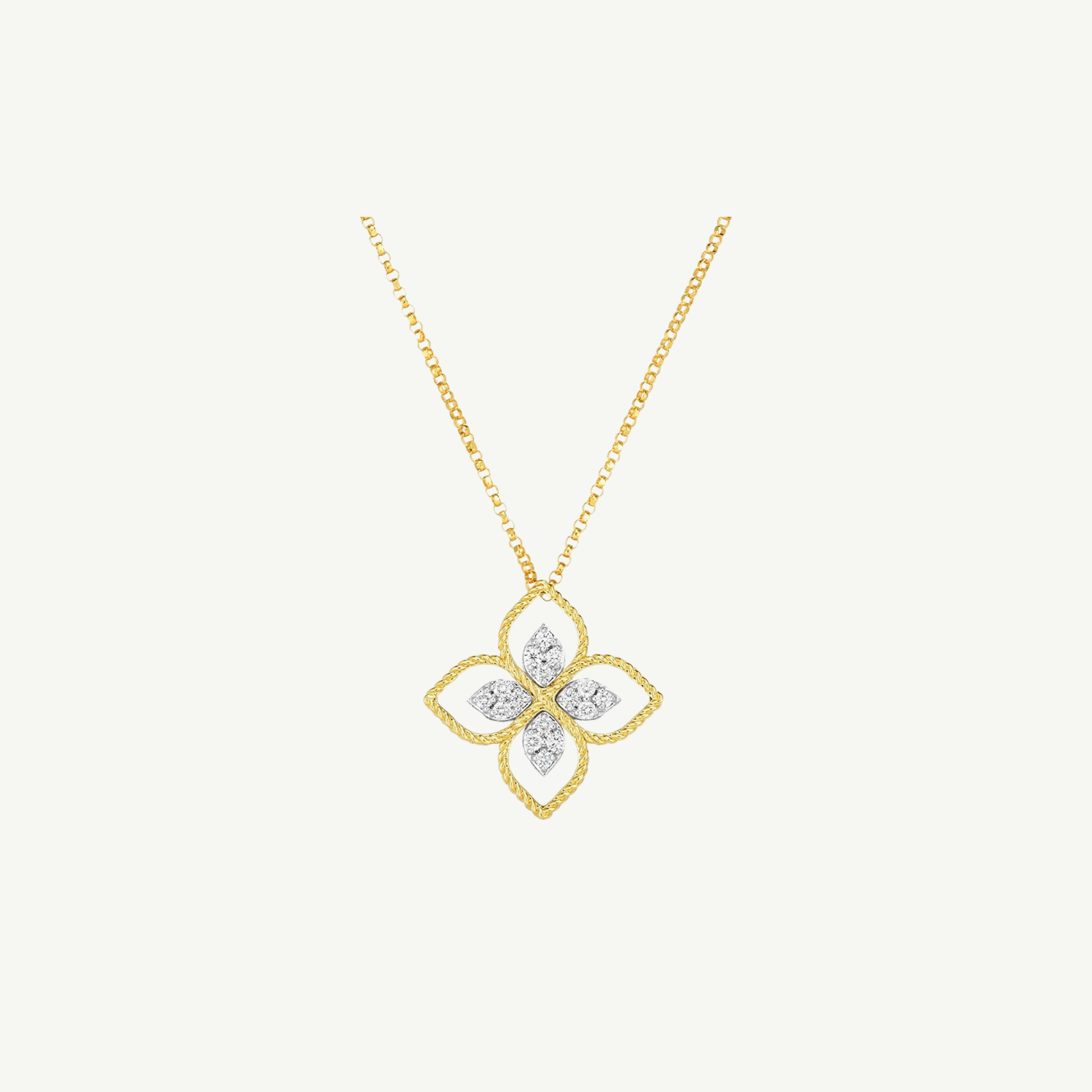 The 18K Principessa Small Flower Pendant by Roberto Coin beautifully embodies nature-inspired elegance with its delicate floral design. Crafted from luxurious 18-karat gold, this pendant features a shimmering diamond at its center, adding a touch of sparkle. Perfect for layering or as a standalone piece, it effortlessly enhances any outfit with its charming and sophisticated appeal.