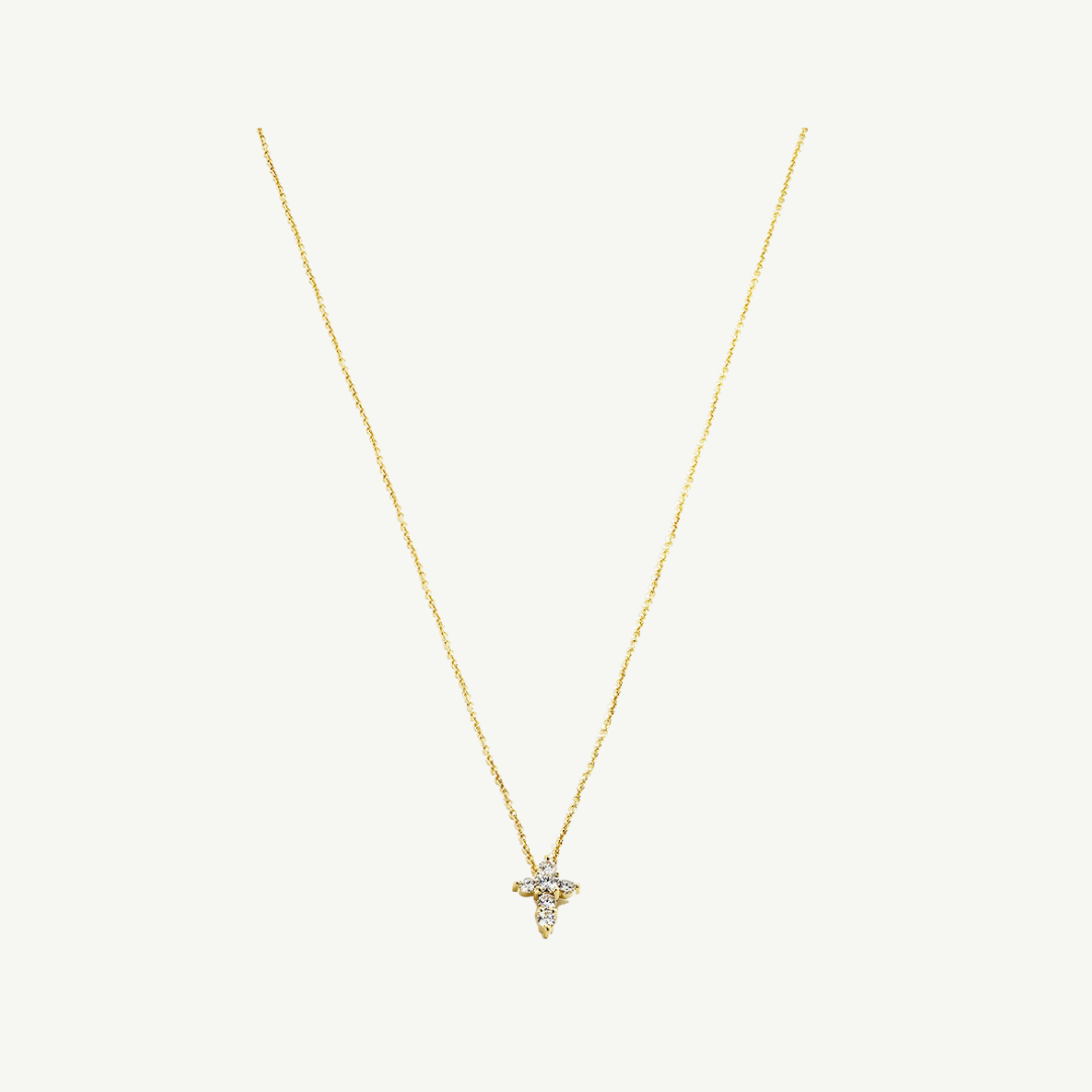 Tiny Treasures is a collection of whimsical 18K gold and diamond pendants by Roberto Coin. There is a piece for every personality. This necklace piece is in solid 18K yellow gold with a baby cross diamond pendant.