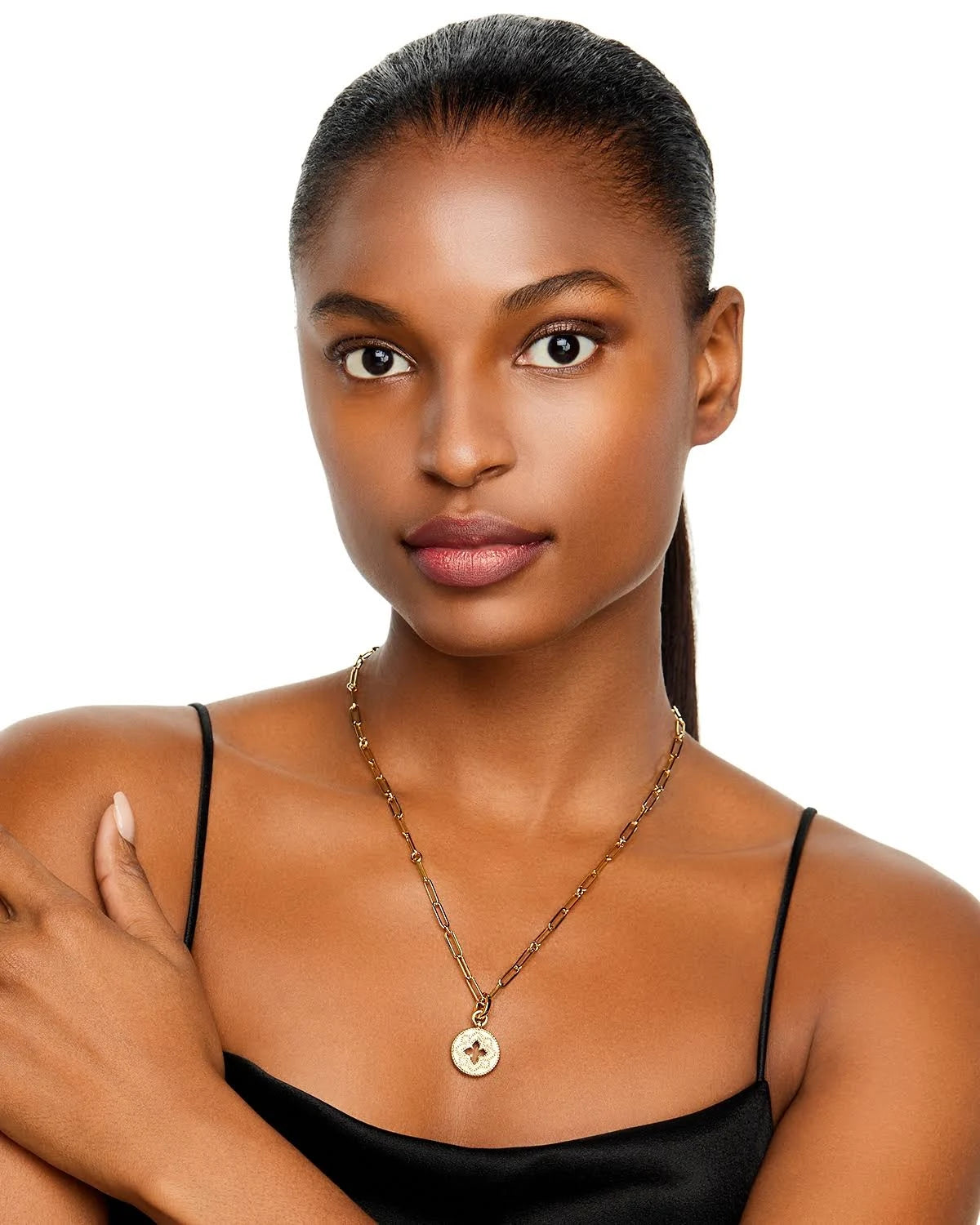The Roberto Coin 18k Yellow Gold Venetian Princess Small Medallion Necklace features a charming design accented with 0.08 carats of sparkling diamonds, creating a perfect blend of elegance and sophistication. Crafted from luxurious 18k yellow gold, this necklace showcases a delicate medallion that embodies the timeless allure of Venetian artistry. Ideal for layering or wearing alone, it adds a touch of refined beauty to any outfit, making it a versatile addition to your jewelry collection.