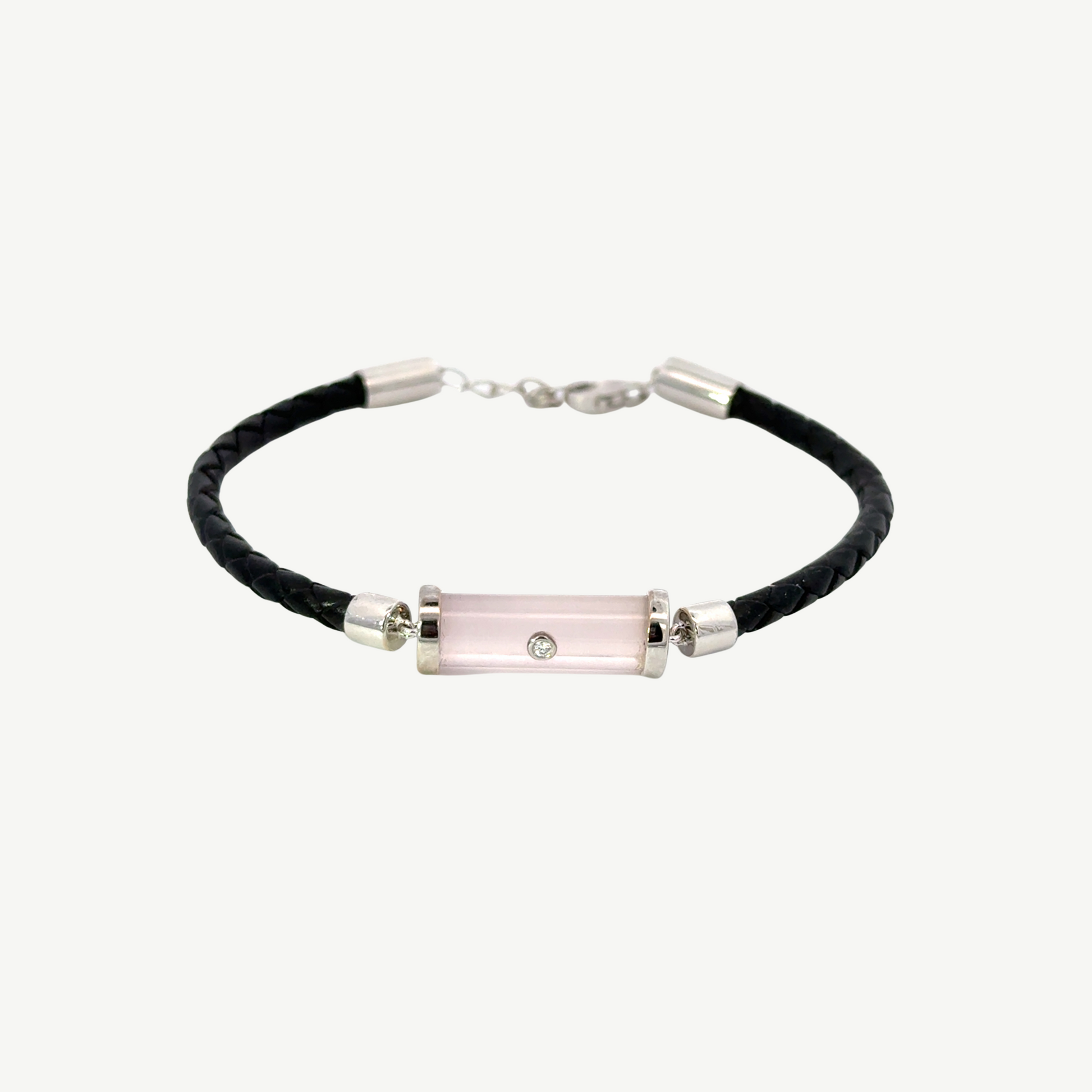 Indulge in the sophistication of our handcrafted rose quartz and diamond bracelet. Each stone is meticulously hand-polished, sourced from the southern regions of Brazil and set on a luxurious leather band. The hardware is 18KT white gold and the bracelet measures 7 inches, with an adjustable clasp for the perfect fit. Elevate your style with this exclusive piece.