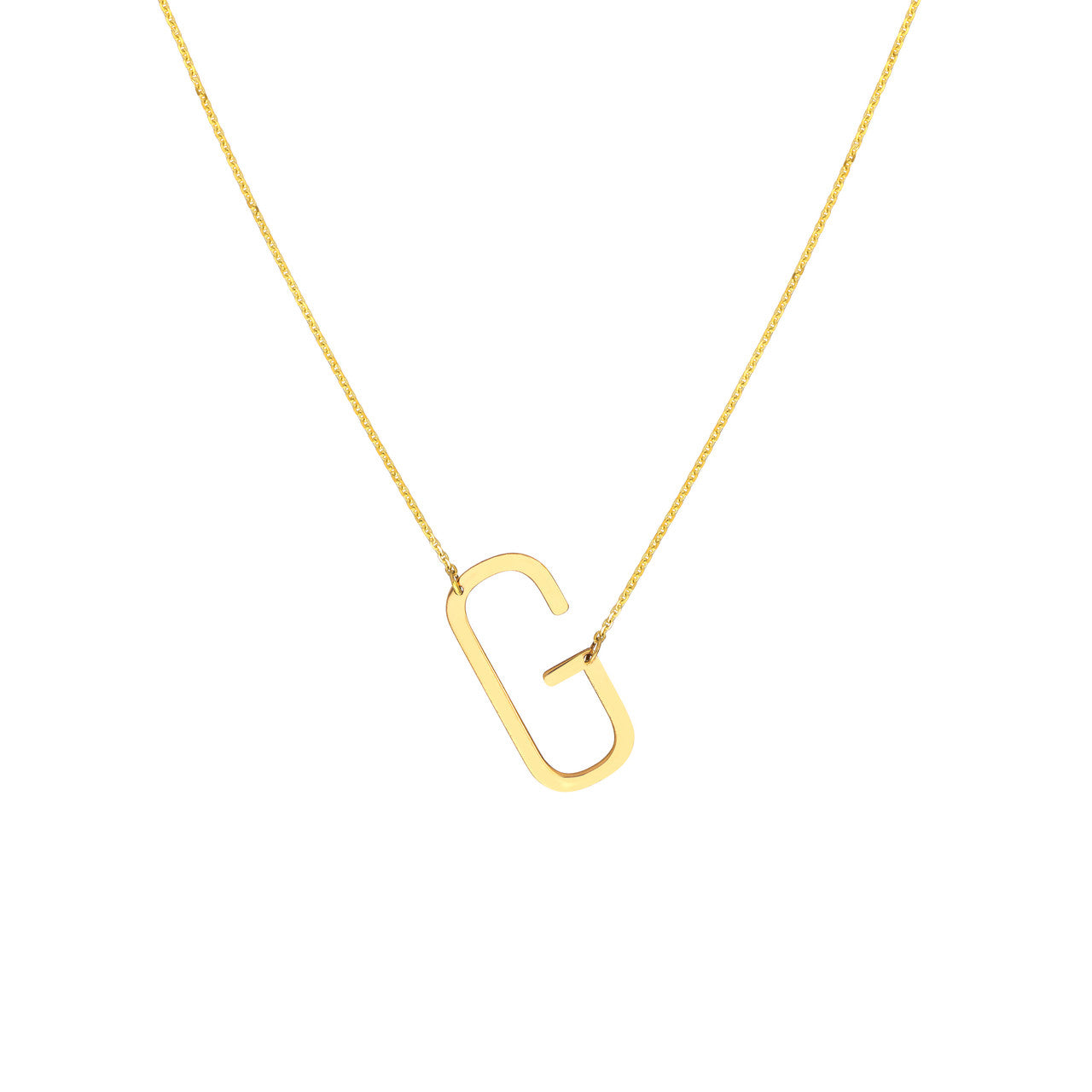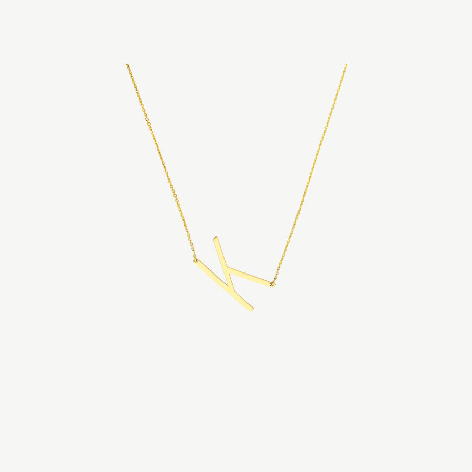 Design your own necklace with a sideways block initial pendant. The initial will measure 20mm wide. Available in 14K yellow, white or rose gold.
