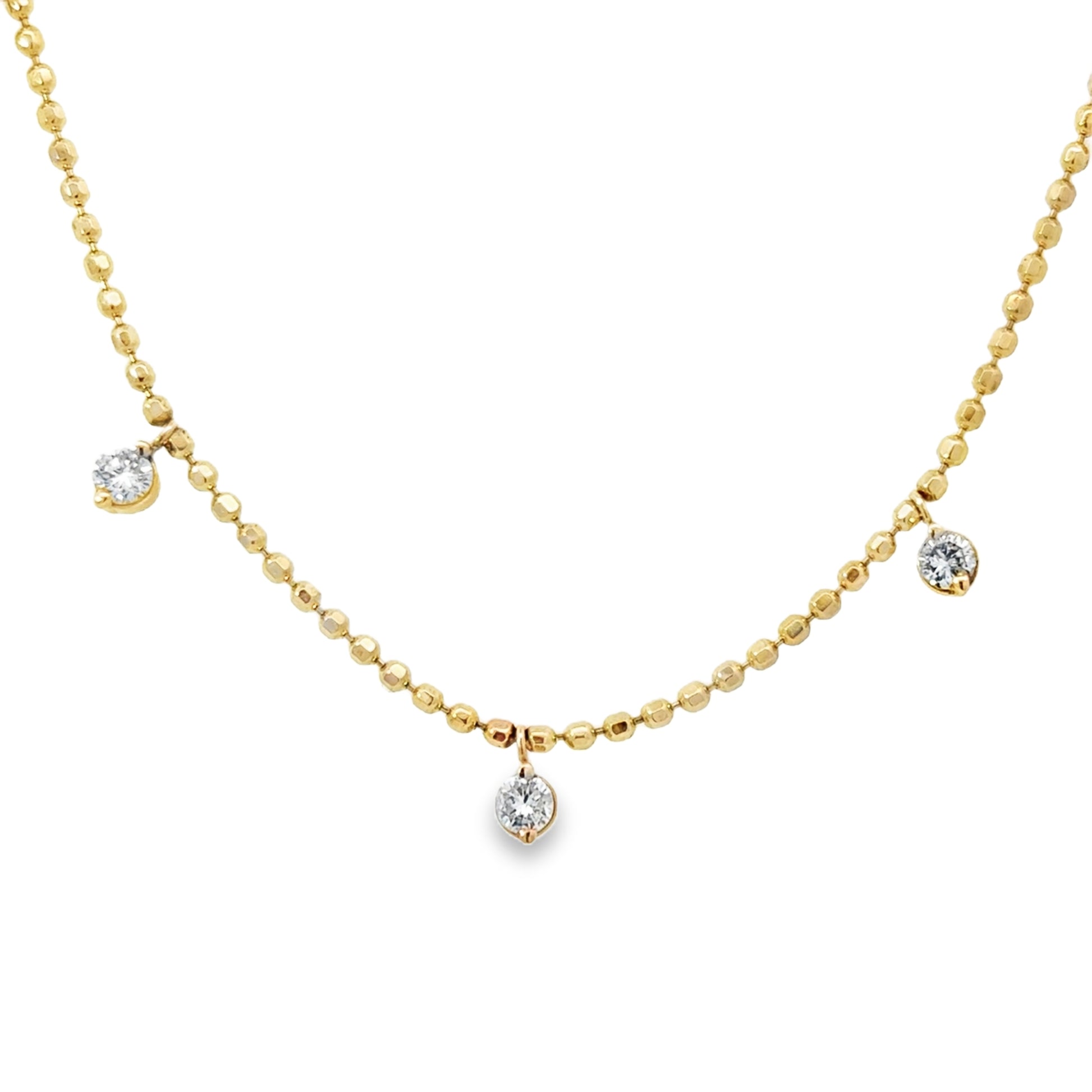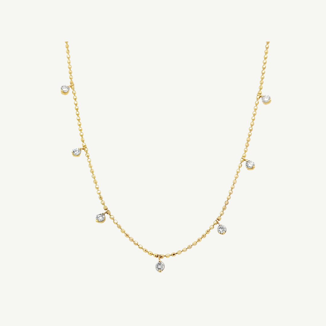 Add a playful touch to any outfit with our Stationed Bezel Necklace. This quirky accessory features a 14K yellow gold chain and 7 dazzling diamond dangles, totaling .84 carats. Make a statement with this bead-dazzling addition!