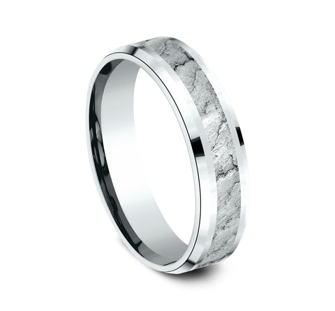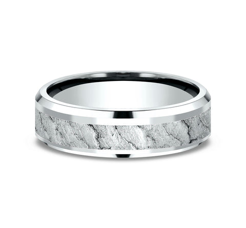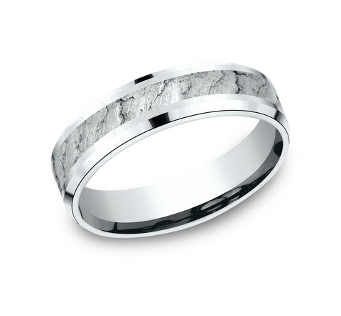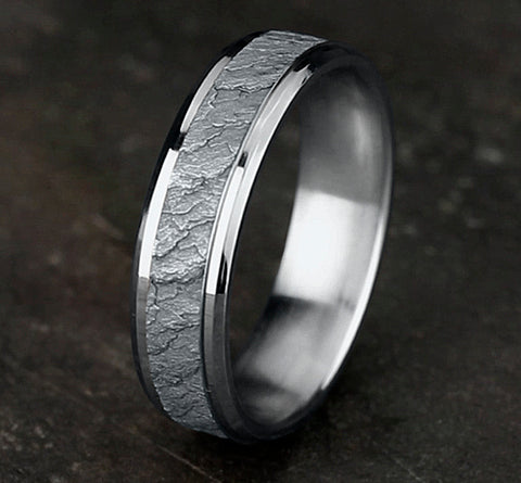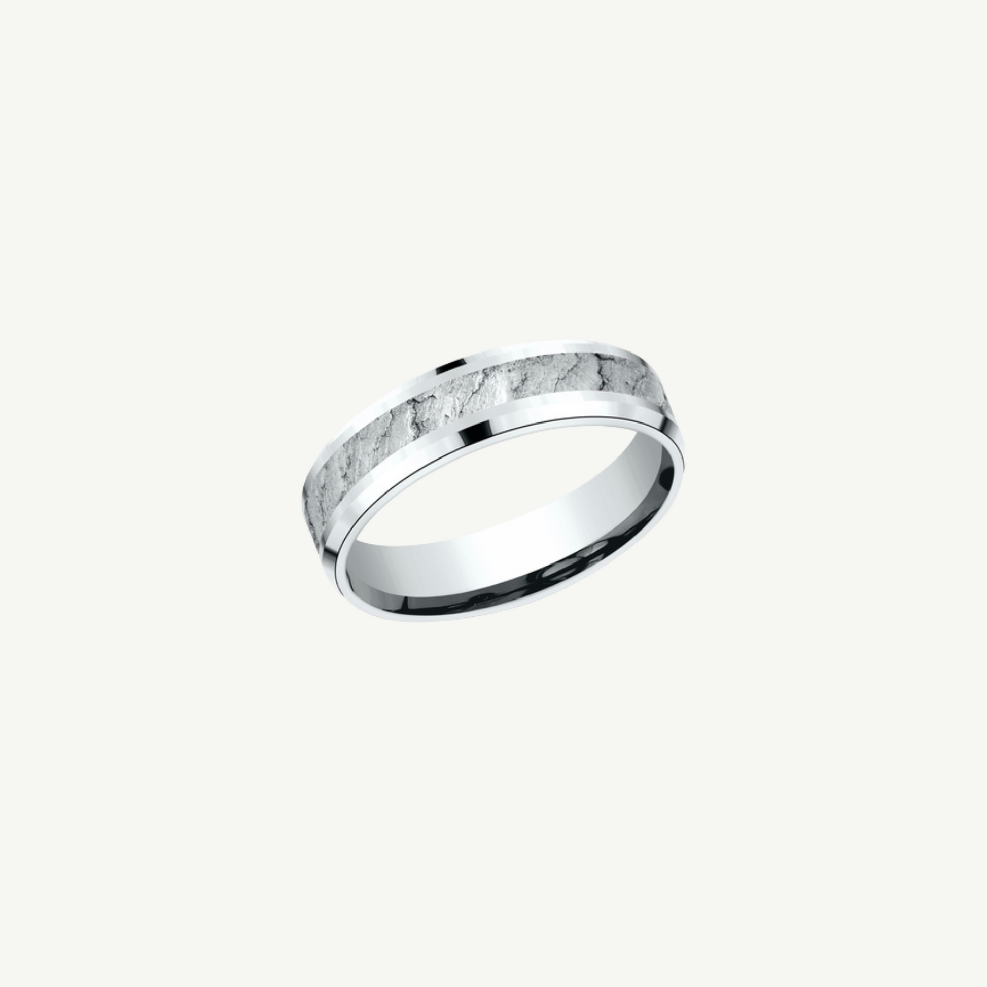 The Vesuvius wedding ring by Benchmark is a captivating choice, expertly crafted from cobalt chrome for its impressive durability and shine. Its distinctive design features a combination of polished and matte finishes, evoking the dynamic beauty of volcanic rock. This ring seamlessly blends modern elegance with rugged charm, making it a perfect symbol of enduring love.