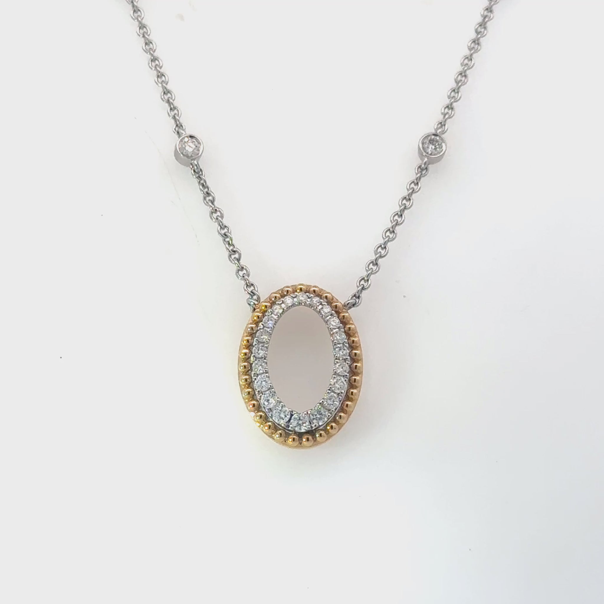 This elegant two-tone necklace features an oval halo pendant with round brilliant-cut diamonds pav3-set in white gold, bordered by a yellow gold beaded edge. The white gold cable chain is accented with bezel-set round diamonds, offering a sophisticated and symmetrical multi-stone arrangement with high polish and exceptional clarity.
