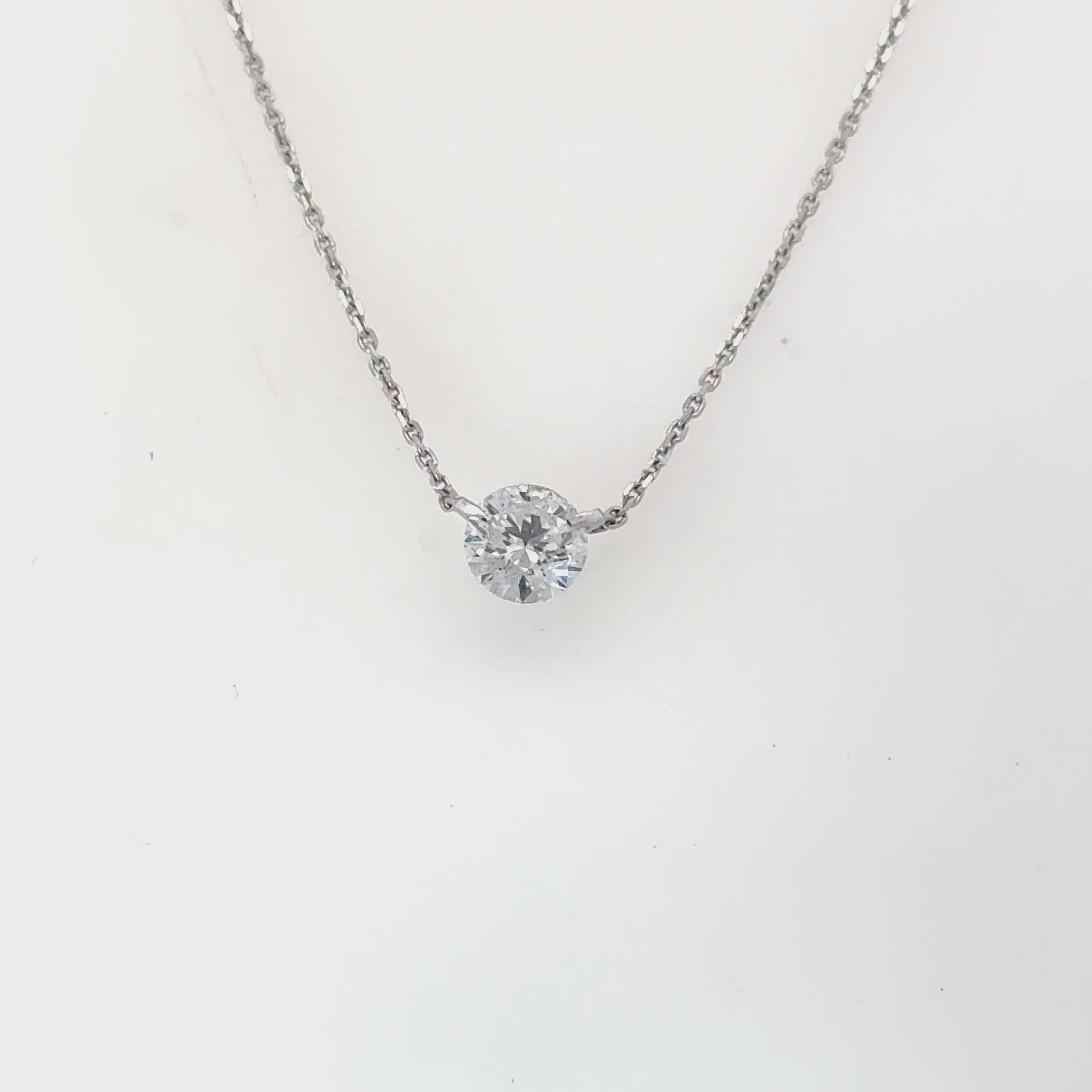 A single round-cut diamond serves as the focal point of this minimalist necklace, secured directly to a delicate cable chain. The white gold setting offers a seamless, bright finish that perfectly complements the center stone. This classic solitaire design provides a versatile and understated look suitable for everyday wear.