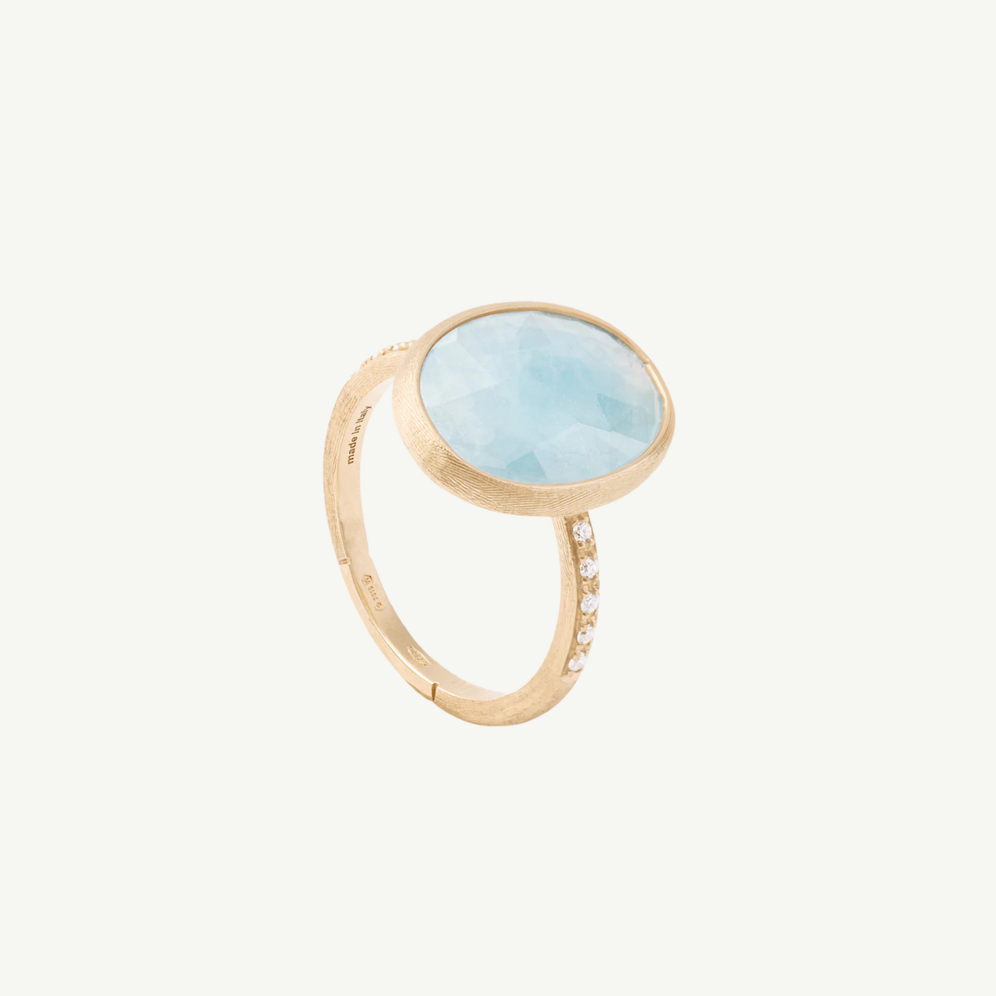 Sparkle and shine with this unique Yellow Gold Aquamarine Ring. The central milky aquamarine is set in 18K yellow gold and the band is adorned with brilliant-cut diamonds. The hand-engraved bezel adds a touch of ancient Florentine technique. Make a statement with this delicate and quirky ring!