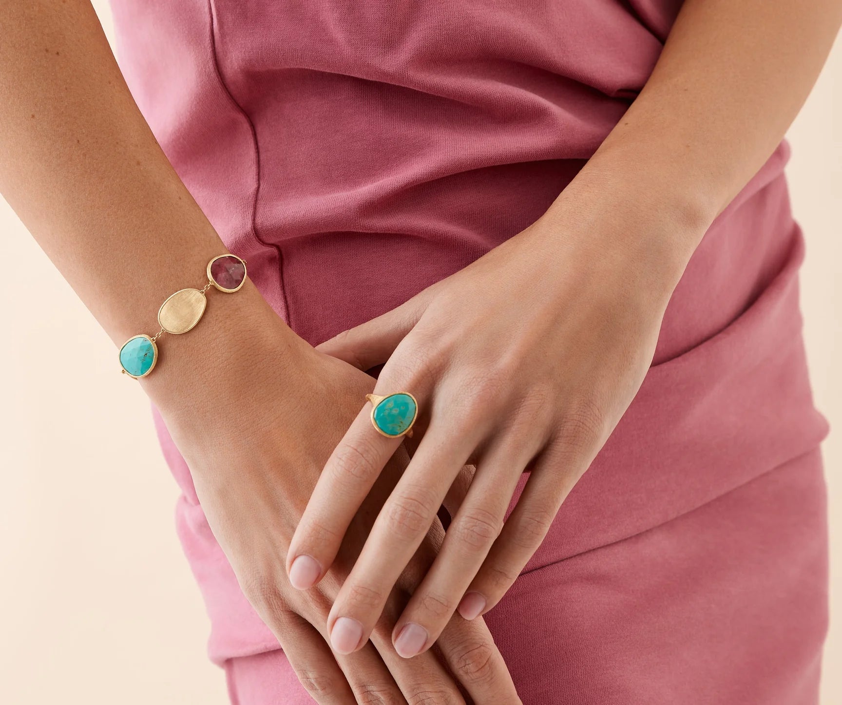 Radiant and full of hue, this bracelet showcases a lovely mix of luminous 18K yellow gold foliage, thulite, turquoise, and charoite. Each golden leaf is intricately etched by hand using the historic Florentine method, intertwined with a sleek chain. A flawless piece to elevate any ensemble with a pop of color.